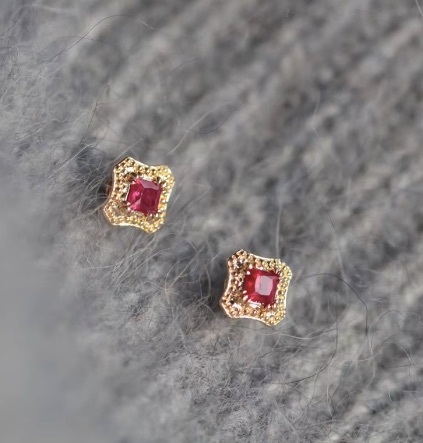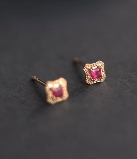 スクエアカットのルビーのひし形のクラシカルなデザインのピアスです。