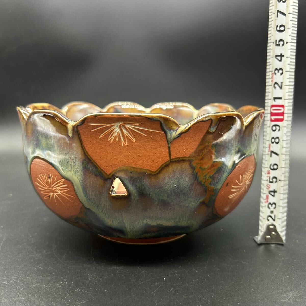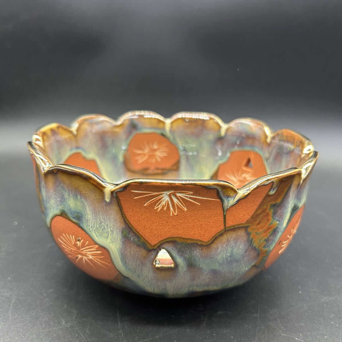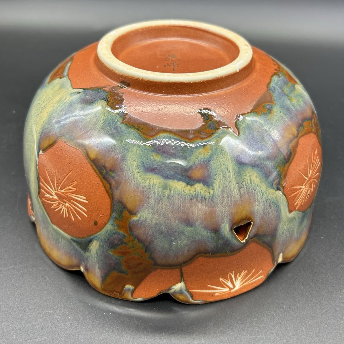 晃泉 晃峰 赤釉菊絵 口金天目菊 菓子鉢 深鉢 盛鉢 鉢 ボウル 三角穴透かし 菓子器 和食器 エ15