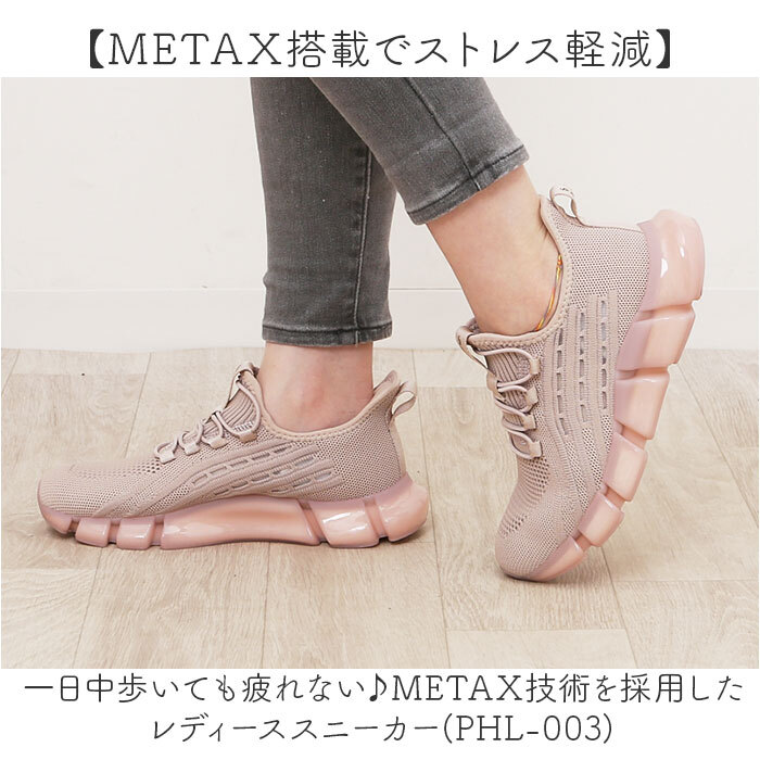 商品説明 | ・・【METAX搭載でストレス軽減】 ・一日中歩いても疲れない♪METAX技術を採用したレディーススニーカー(PHL-003) ・【METAX技術】 ・ファイテン社技術の水溶化メタル技術(METAX)を融合して開発されたスニーカー。 ・【リラックス状態へと導く】 ・インソールはMETAX布地を採用し、体をリラックス状態へとサポートしてくれる。 ・【衝撃を吸収するソール】 ・ソール部分はTPU素材で衝撃を吸収し足裏への負担を軽減。 ・【蹴り出しをアシスト】 ・さらにTPU素材特有の反発力で心地良い蹴り出しをアシストしてくれる♪ ・【長時間履いても疲れにくい】 ・かかとを優しくホールドするロングカウンター構造で歩行の安定感が増し、疲れにくい。 ・【夏でも快適に履けるメッシュ地】 ・表地は通気性が良く蒸れにくいメッシュ地を使い、暑い時期も蒸れずに快適に履ける。 ・【着脱スムーズな履き口】 ・履き口は開いたままキープされているので、手を使わずに着脱ができるのも嬉しいポイント。 ・【結ばないシューレース】 ・結ばずにほどけないシューレースをアッパーに配置。手間なく自然に自分サイズにフィット。 ・【靴擦れを防ぐ】 ・靴の柔らかい素材と、かかと部分はクッションを内蔵し靴擦れを防ぐ優しい履き心地に。 ・【シンプルで使いやすい】 ・コーデを選ばないワンカラー仕様。アッパーのブランドロゴとサイドラインがアクセント◎ |