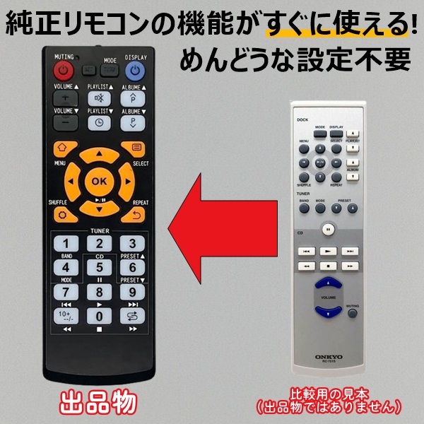 | 【商品名】 ONKYO RC-751S 代替リモコン 【対応機種】 A-5VL A-7VL用 比較画像の右側の純正リモコンが付属する機種に使用出来ます。 上記機種以外については、質問欄よりメーカーと型番をご連絡頂ければ、対応品のご案内をしております。 【商品について】 左側の代替リモコンが出品物になります。右側のリモコンは見本画像です。 タイトル機種のリモコン信号を入力した、設定不要で使える純正品と同等の代替リモコンです。 乾電池は付属しません。別途ご用意下さい。(単4乾電池×2本) 【商品サイズ】 縦15cm×横5cm×高さ2.3cm 【発送について】送料無料 迅速発送を心掛けております。土日祝日はお時間を頂く場合ございます。 ポスト投函配達となり、日時指定は出来ません。 | ||
