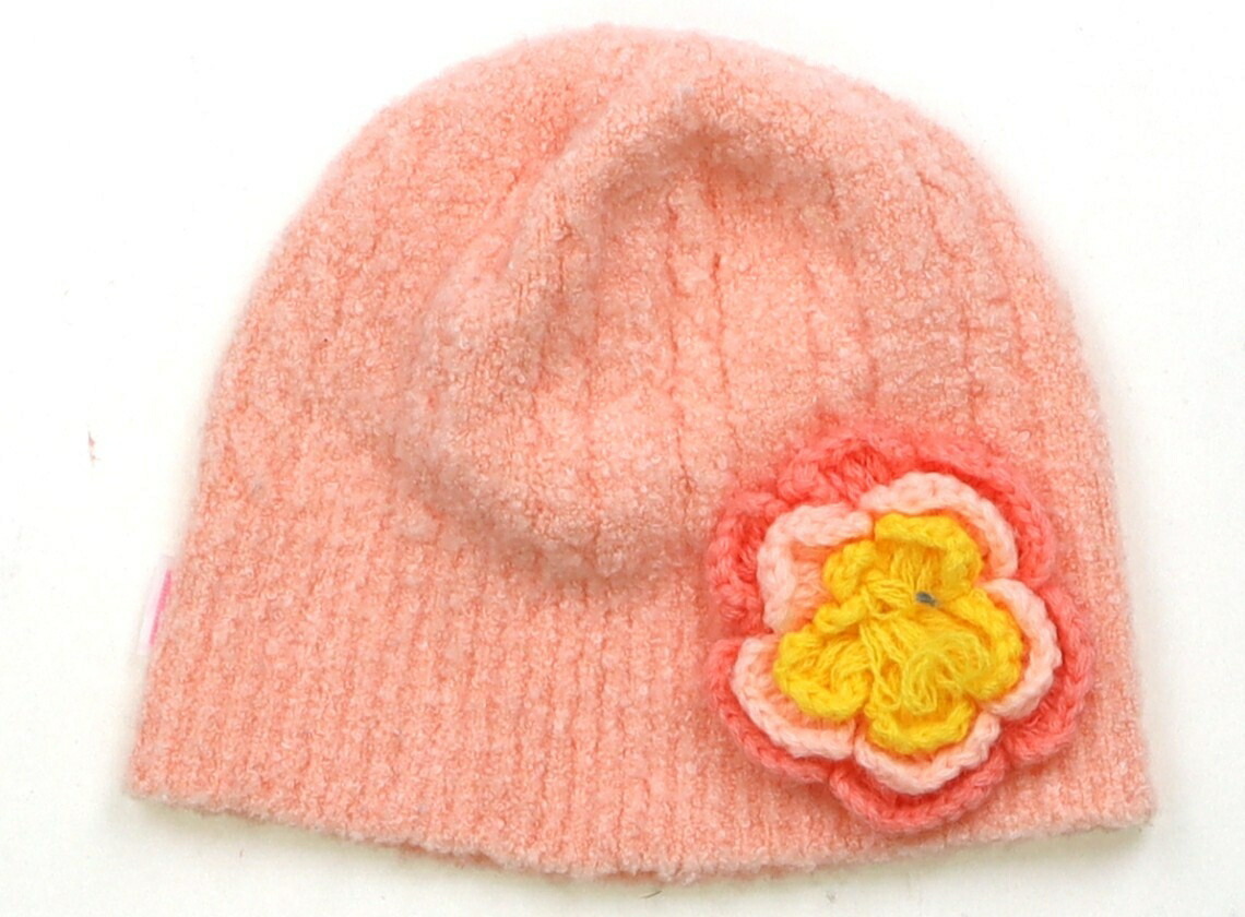 サイズはフリー(42-50)で、アクリル・ナイロン・ポリウレタンのニット帽です。花柄の飾り部分の糸がほつれていて、毛玉がありますが、普段使いにいかがでしょうか。
