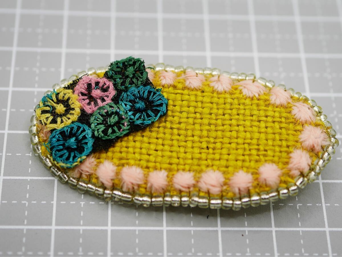 ほつれ防止に、ほつれ止め液を塗り、さらに周りをビーズ刺繍でかがりました。