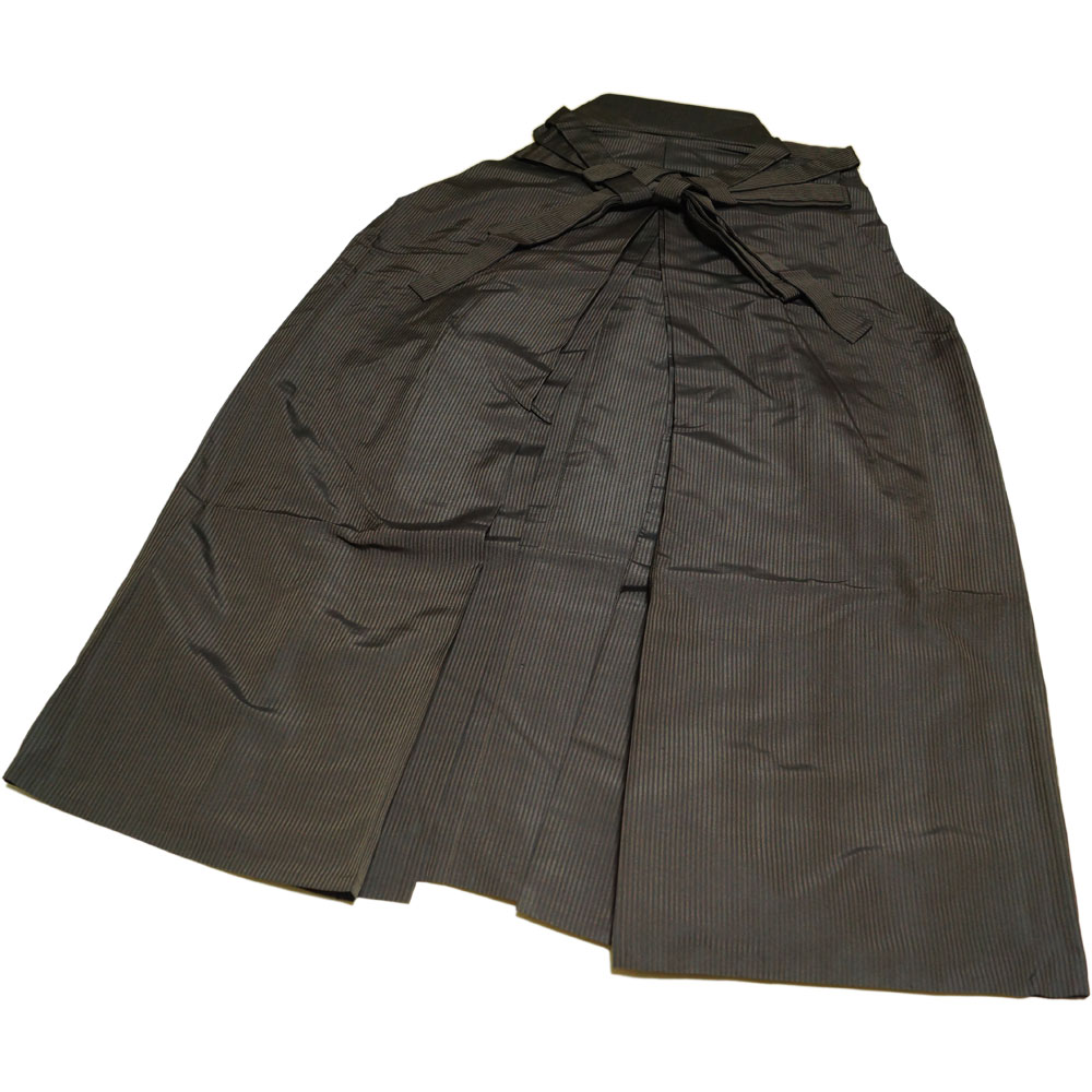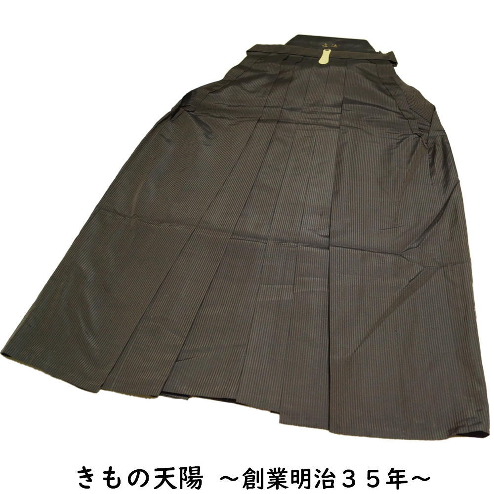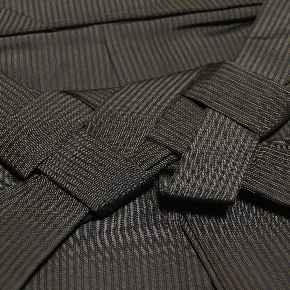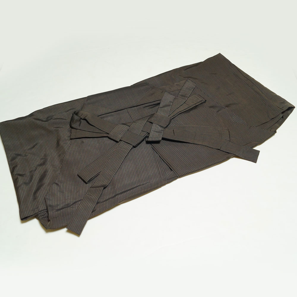 商品 説明 | しっとりとした海松茶色系の正絹の地に黒色系の縞模様が施された男袴です。股の無い行燈型(スカートタイプ)です。腰板にストッパーのベロが付いております。 |