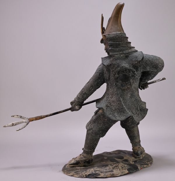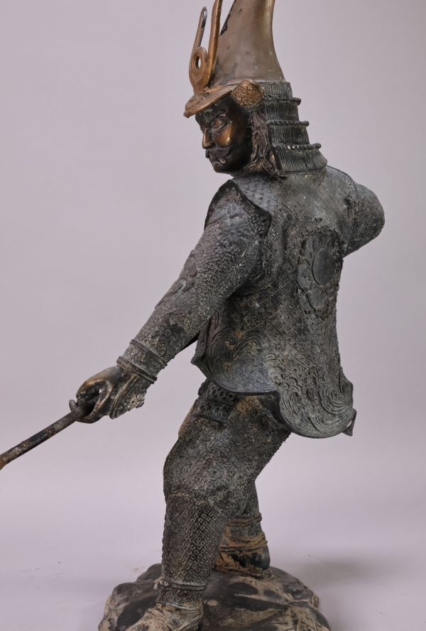 時代金工 明治期 ブロンズ像 銅製 加藤清正 武者 武士 薙刀 置物 床飾 高58㎝ BK091