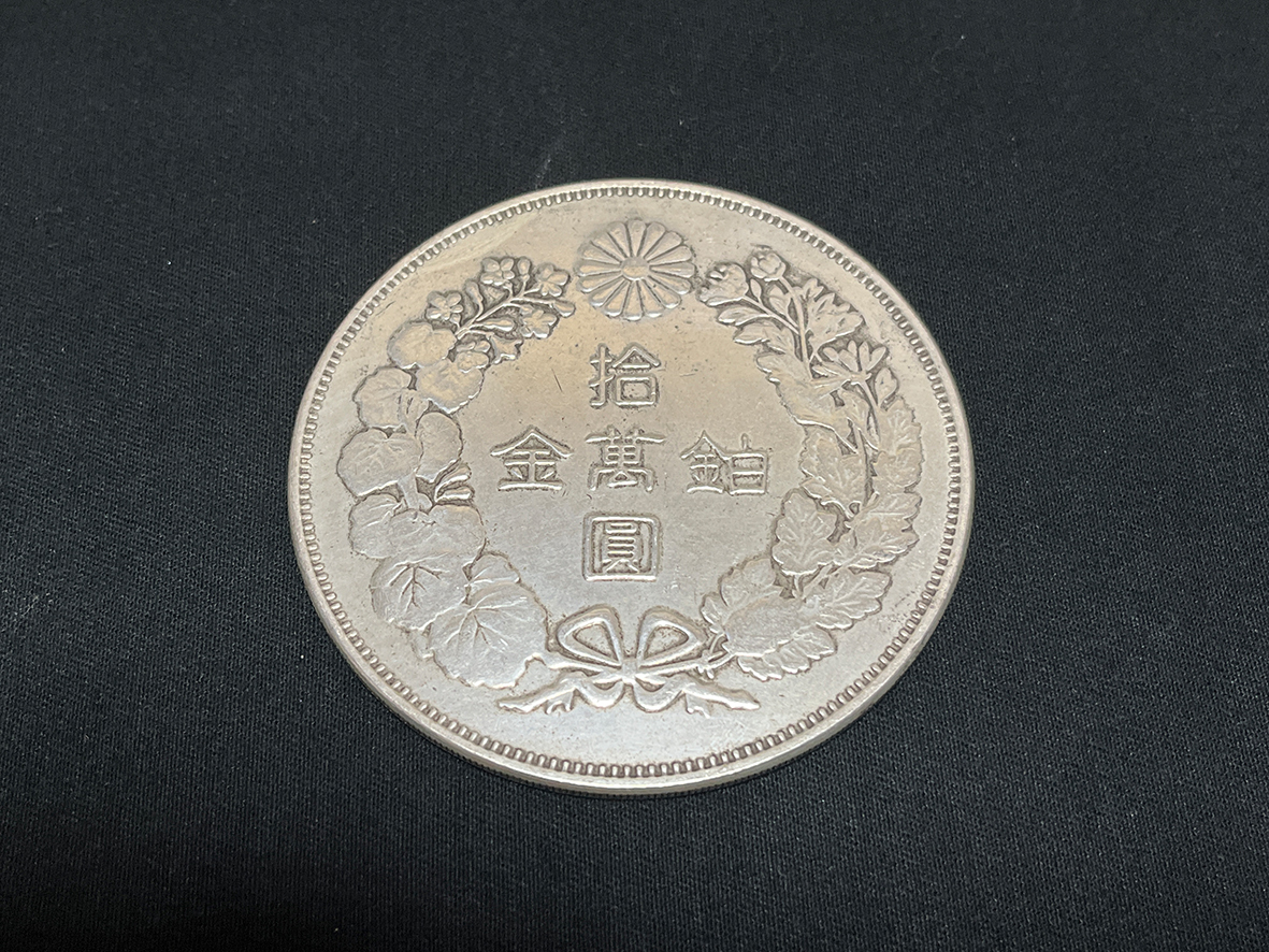 【A144】大日本明治八年古銭貿易銀 銀貨「鉑金十萬圓 七両二銭」銘 菊紋背龍 重さ約130g 直径約87.5mm 美品 激レア