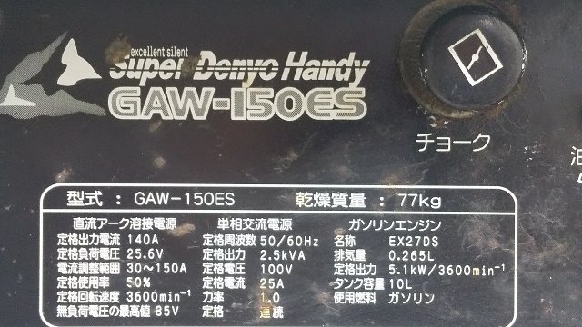 | 状態 | ※バッテリーが消耗しており弊社のジャンプスターターでエンジンの始動を確認致しました、リコイルスターターも問題はございませんでした コンセントの出力と弊社の備品で手溶接のスパークを確認致しました ※・アワーメーターとスローダウンが破損しております、ご了承の上でご検討をお願いします 外径寸法(mm):約 W670×D480×H640 燃料:ガソリン | ||||||||||||||||||||||