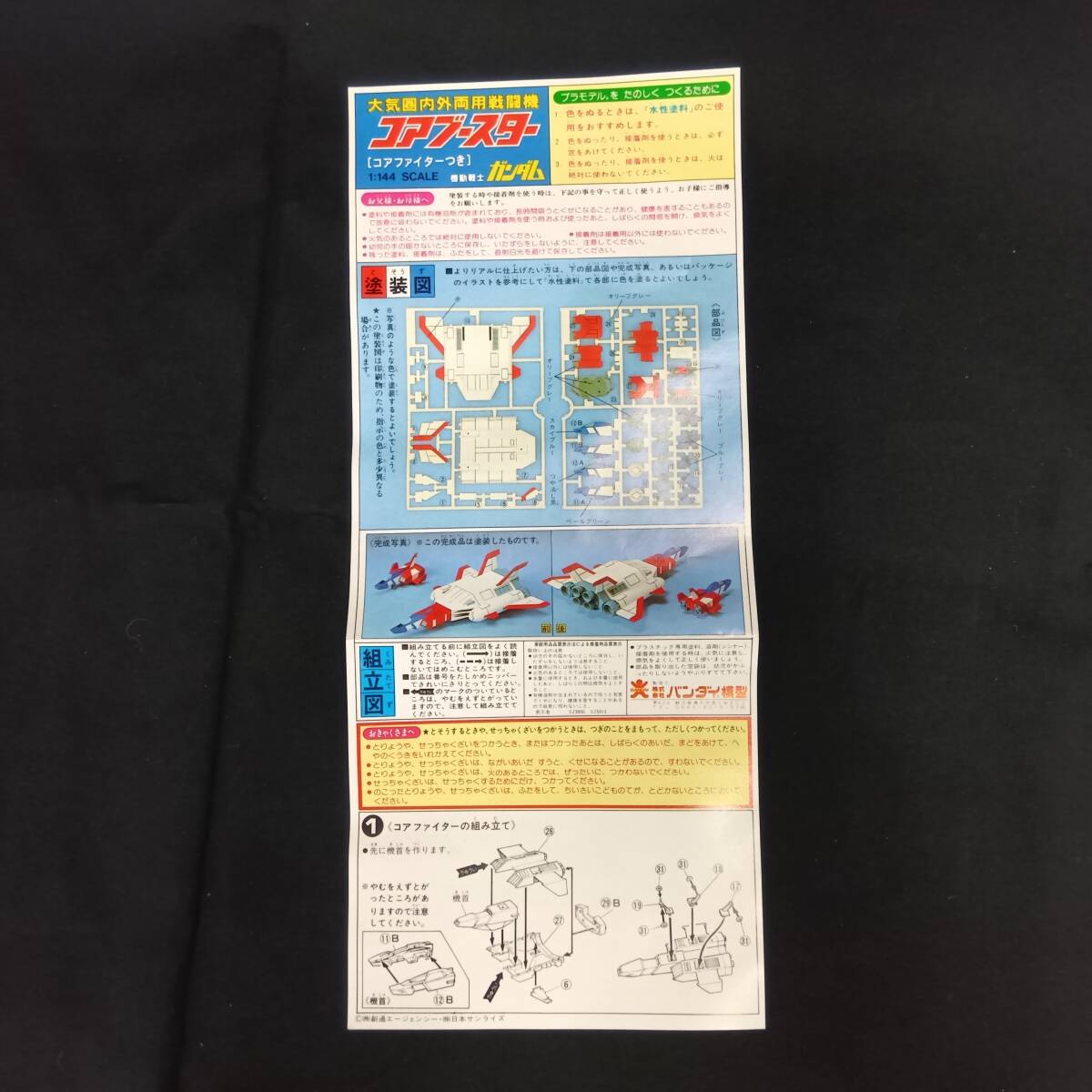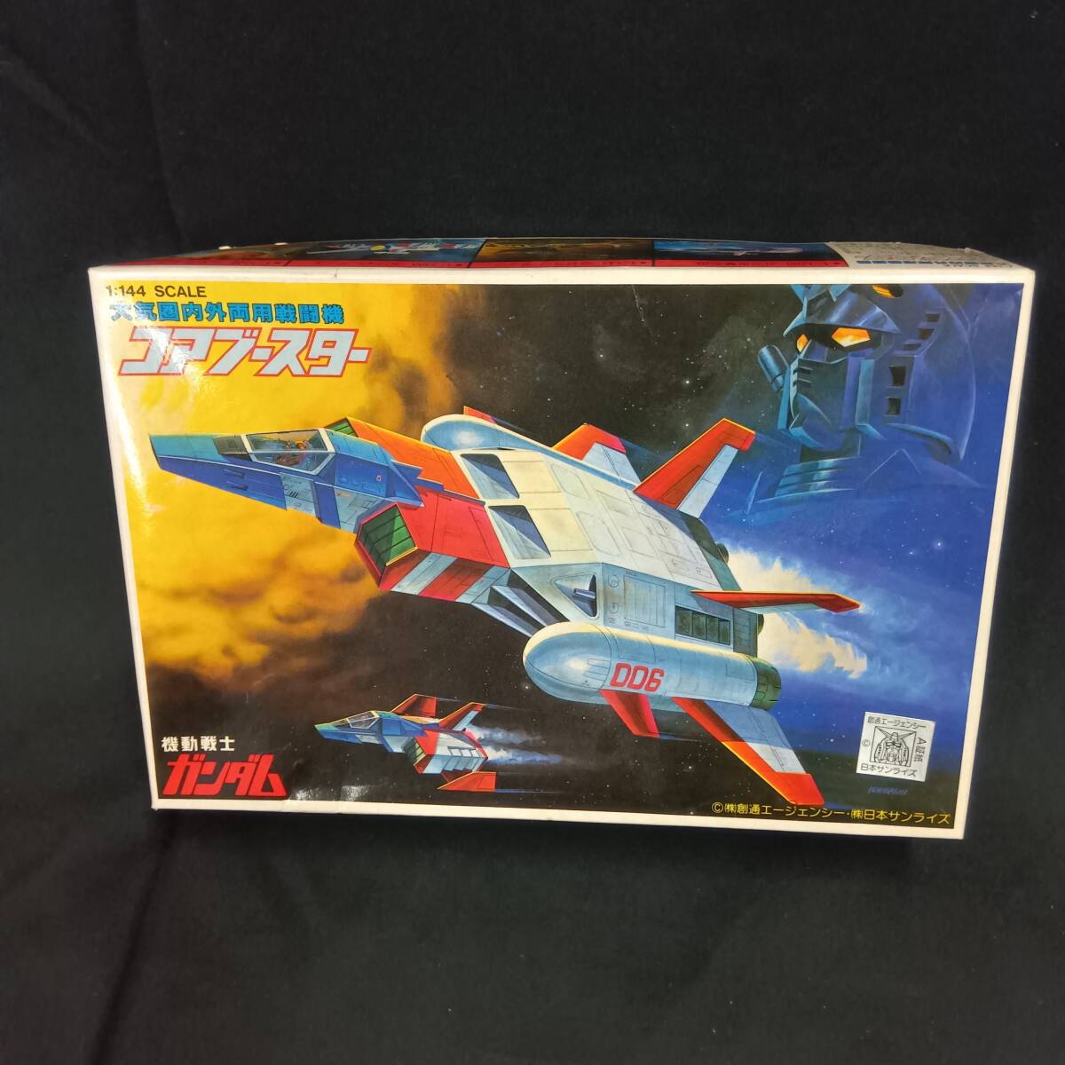 こちらは1982年発売のバンダイ社製コアブースター1/144スケール旧キットです。初代「機動戦士ガンダム」テレビシリーズおよび映画作品に登場する、大気圏内外両用戦闘機コアブースターを立体化したプラモデルで、コアファイター2機が付属し、片方は機体形態の翼を折りたたんだ形状になります。旧キット特有のシンプルな構造ながらも、模型ファンには懐かしく、再販人気の高い希少な逸品です。箱絵も当時の味わいを感じさせるレトロなデザインが魅力です。