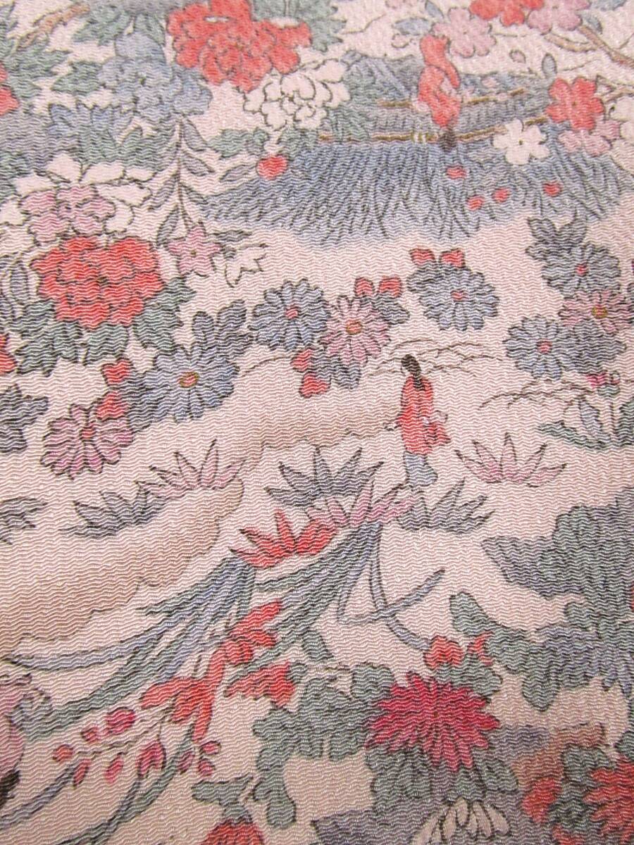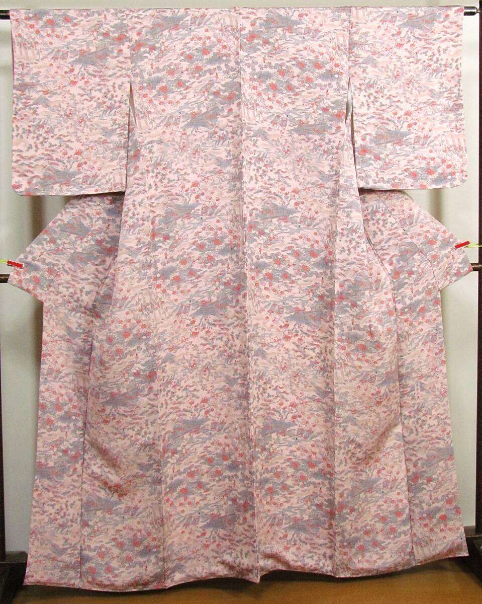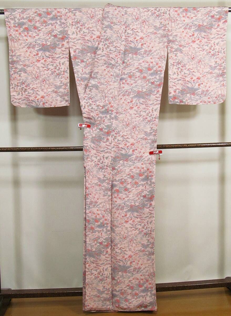 は14 正絹 小紋着物 流水花人物柄 縮緬地 未使用 身丈164cm