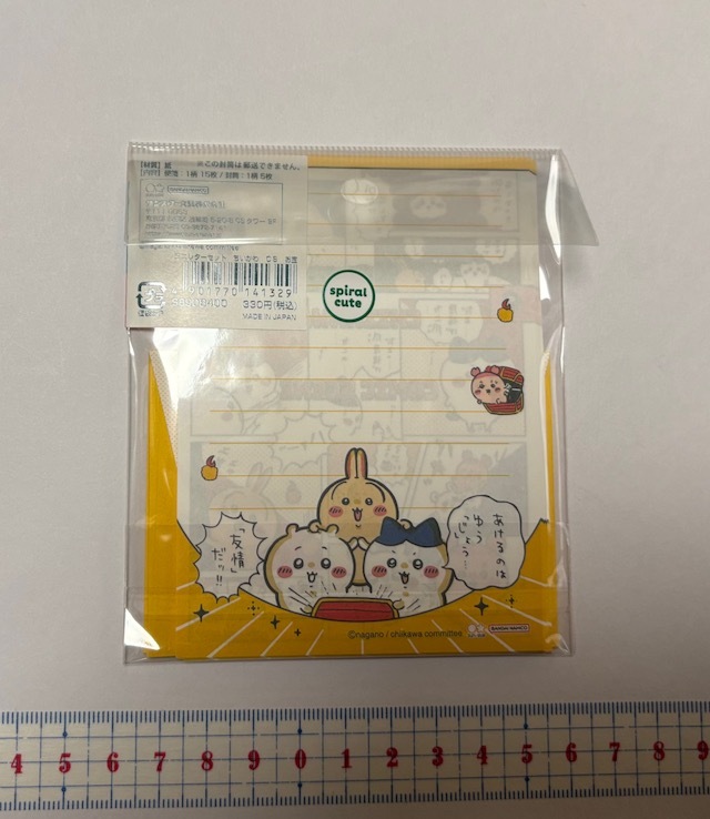 ★この封筒は郵送できません ちょっとしたお礼やメッセージに使えるミニサイズのレターセット。 お宝さがしの大冒険に出るちいかわ達のストーリーが胸躍るデザイン! サイズ(約): パッケージ:H140×W100×D7mm 便箋 :H110×W80mm 封筒 :H64×W90mm 内容:便箋(1柄×15枚)、封筒(1柄×5枚) 税込330円 一応、出品にあたり、確認はいたしましたが、もし他に汚れ、破れ、しみ、書き込み等、見落としございましたらご容赦願います。 他にも出品していますので、よかったら見てくださいね。 他の商品との同時発送も承ります。 |