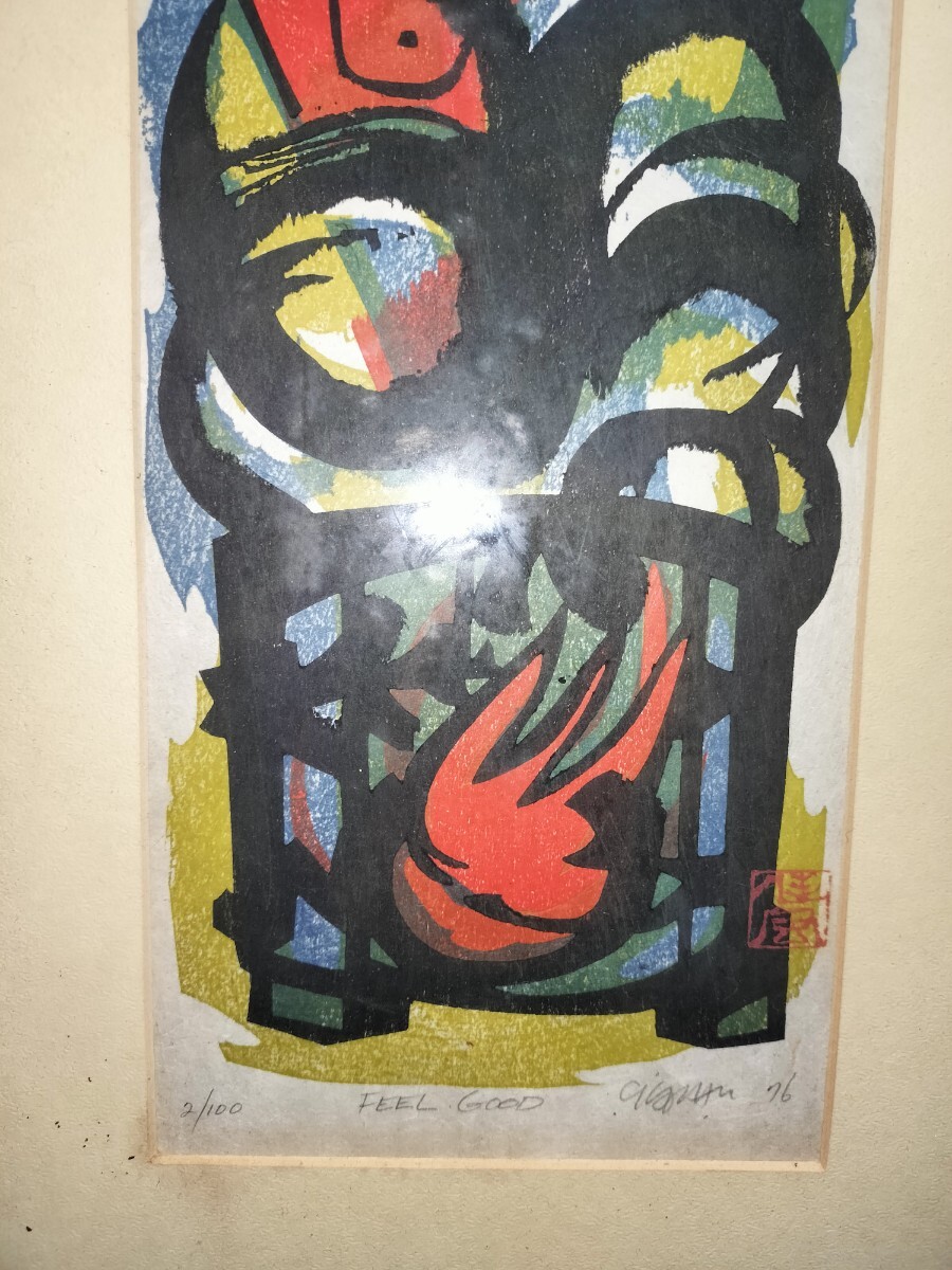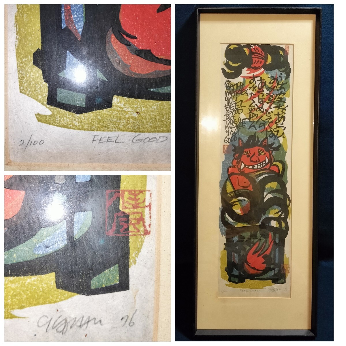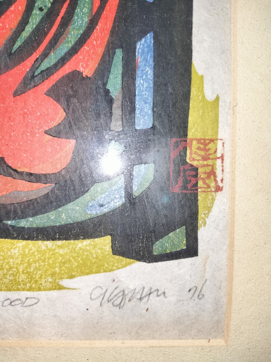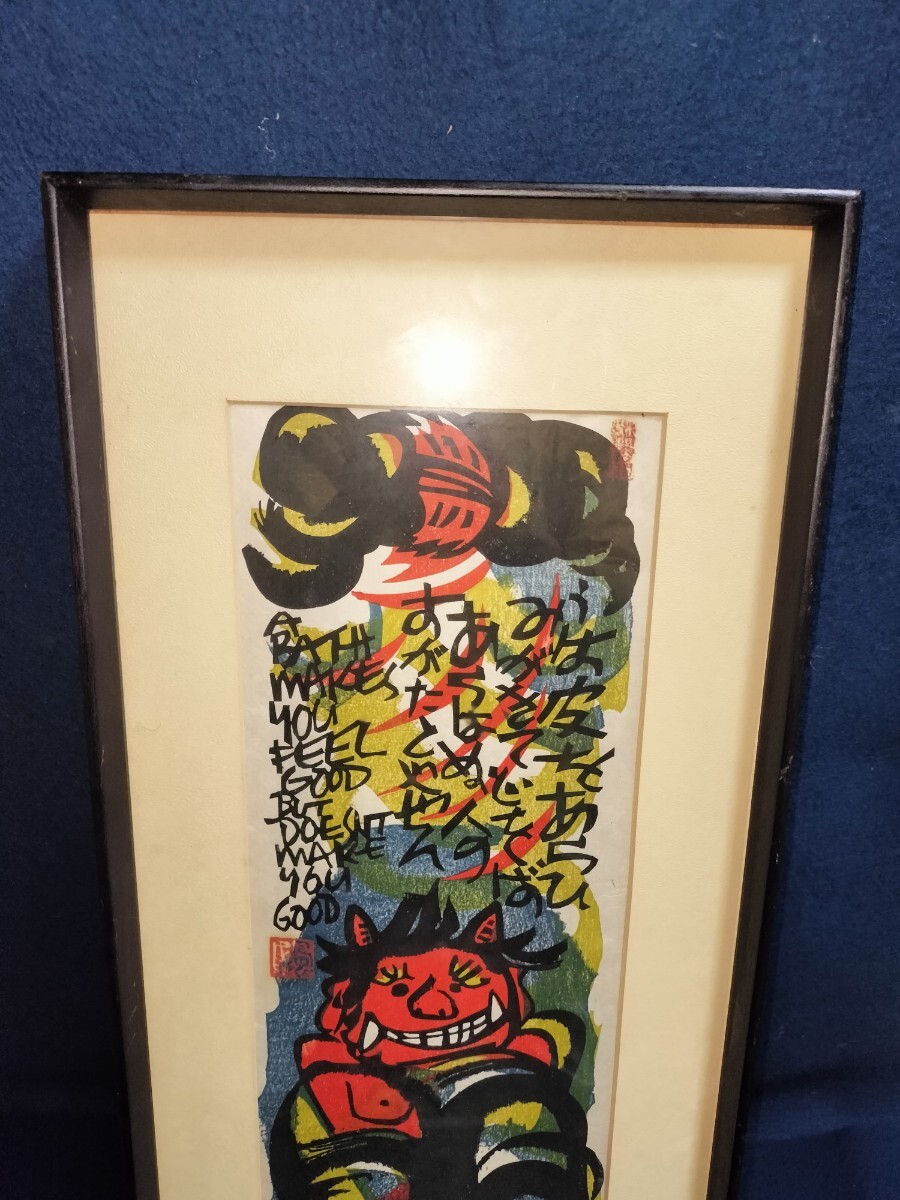 木版画に少シミ、少ヤケ、少汚れがあります。額に当たり傷、少汚れあり。画像にてご確認ください。