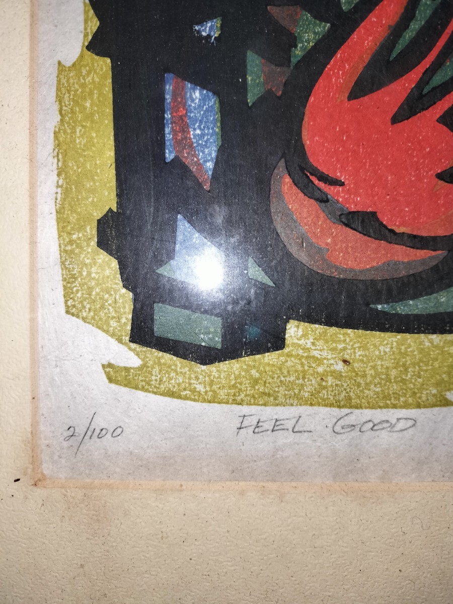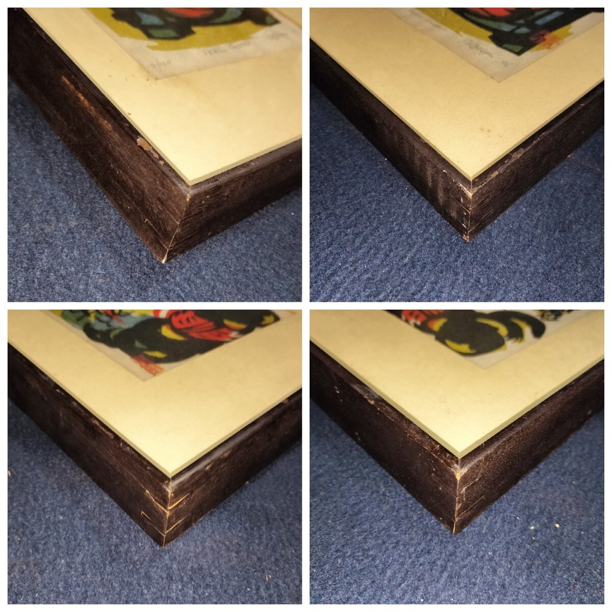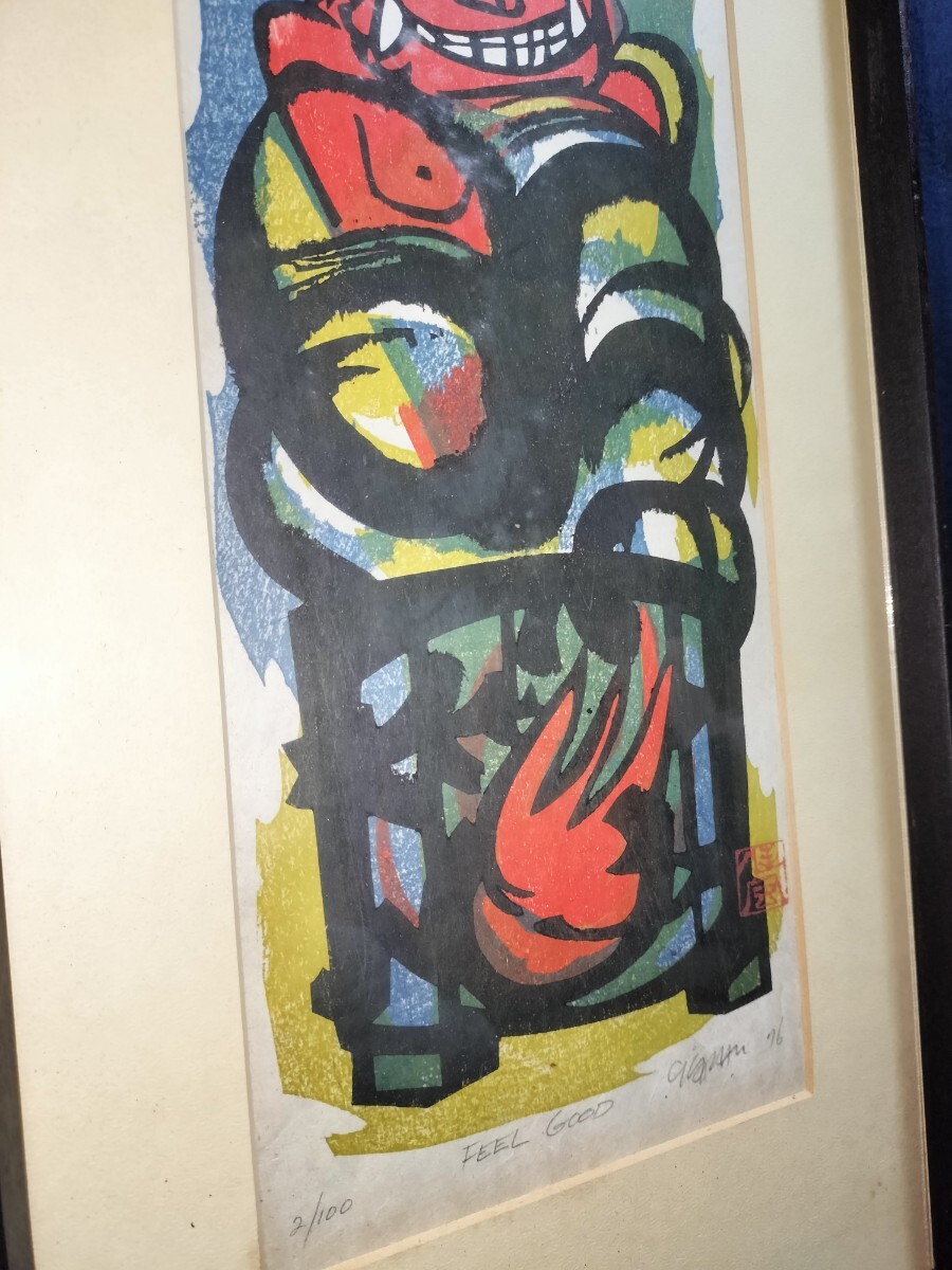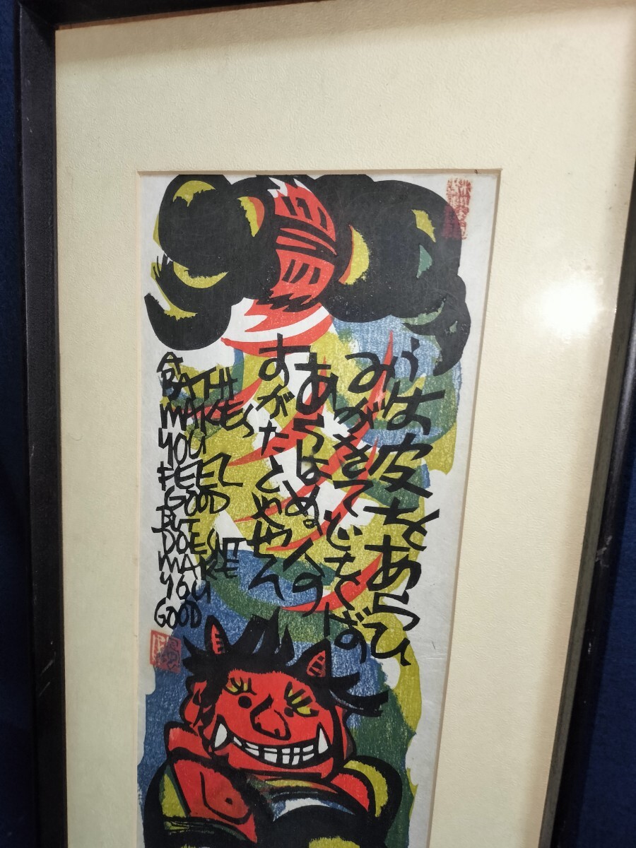 木版画に少シミ、少ヤケ、少汚れがあります。額に当たり傷、少汚れあり。画像にてご確認ください。