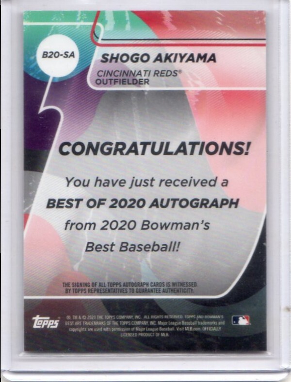 ★商品説明★ | 2020BOWMAN'S BEST OF AUTOGRAPH BLUE REFRACTOR #B20-SA RC TOPPS CERTIFIED AUTOGRAPH ISSUE シリアルNo.045/150枚限定 秋山翔吾 公式直筆サイン&MLBルーキー・カード 秋山ファンの方、是非どうぞ! |