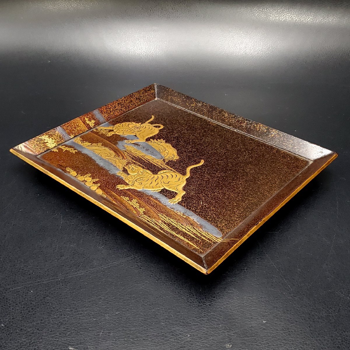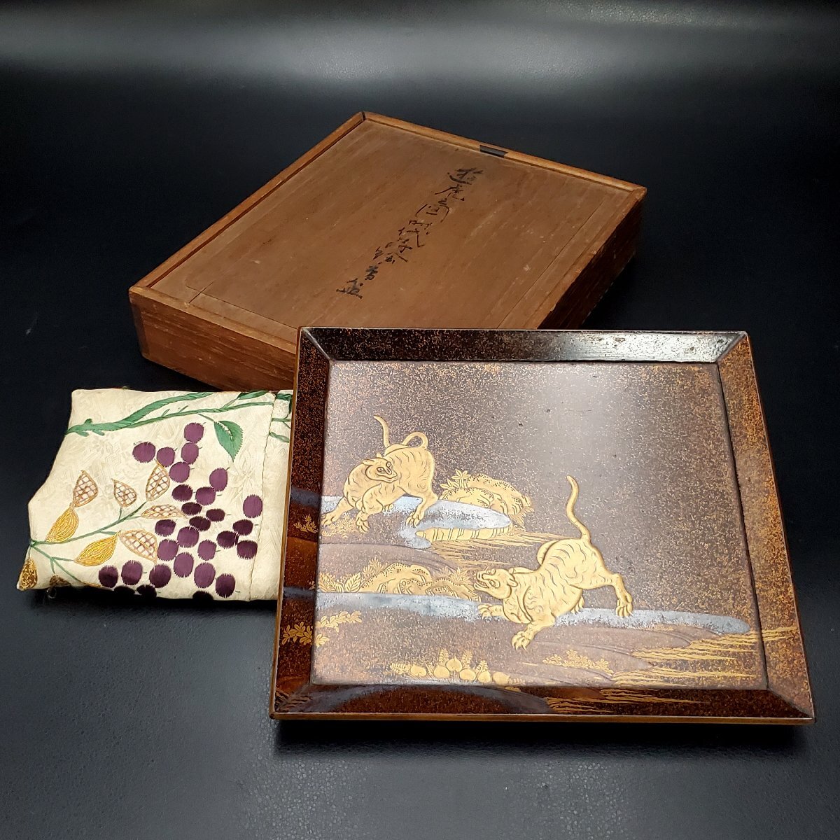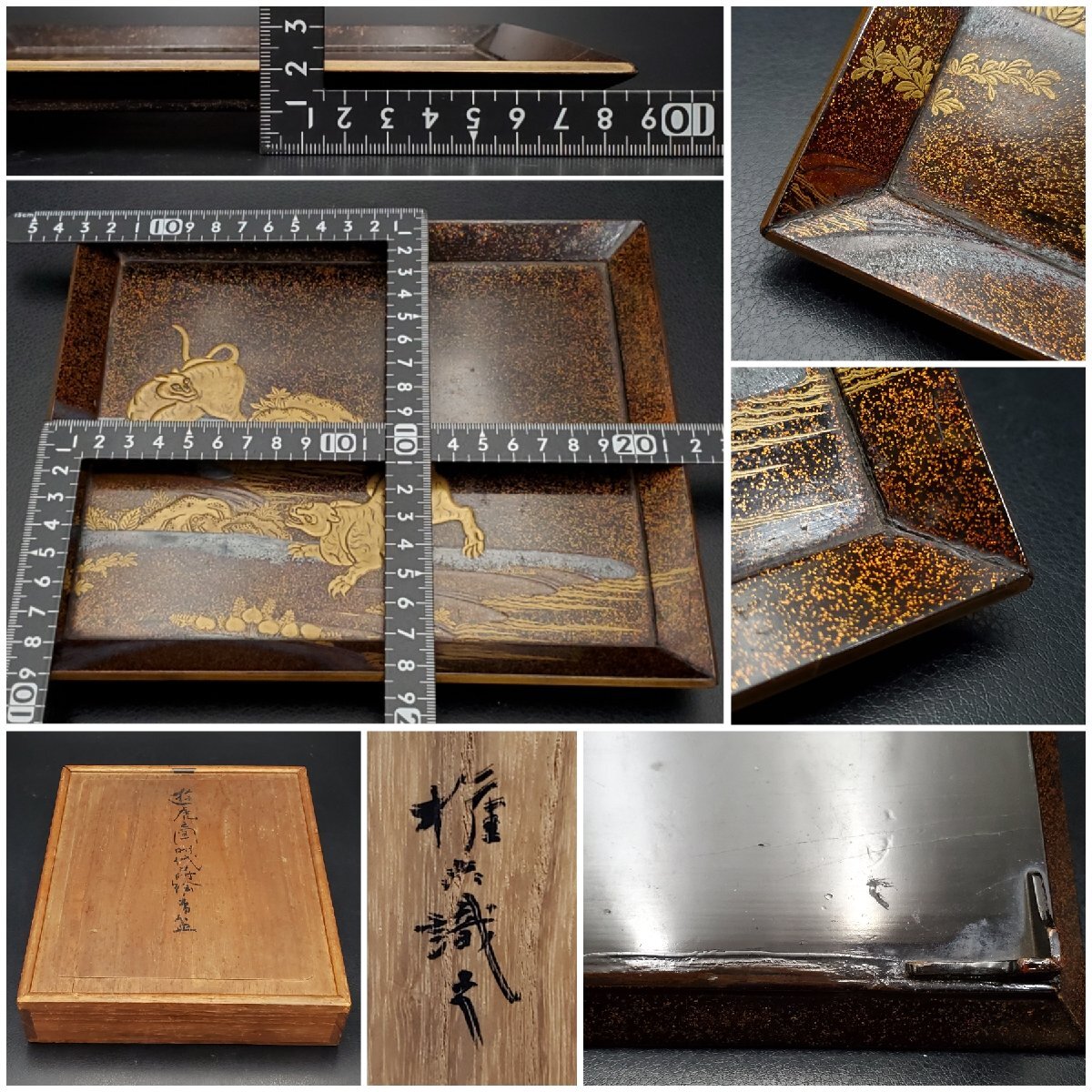 【宝蔵】時代漆器 金銀盛蒔絵 遊虎之図 香盆 約21.5㎝×約18.5㎝ 権六識之 時代箱