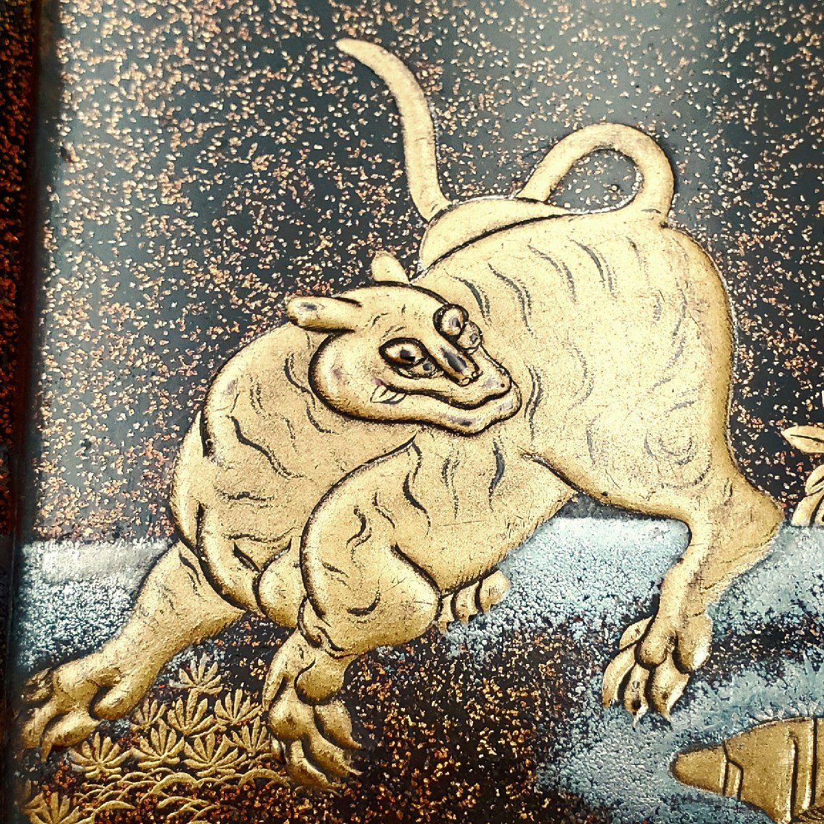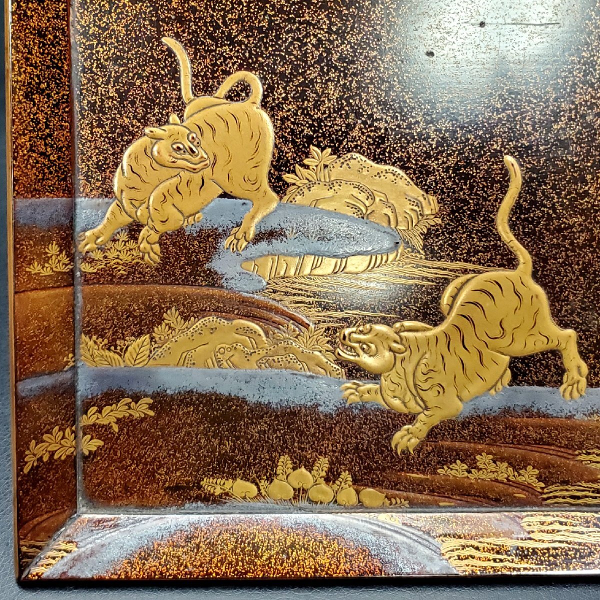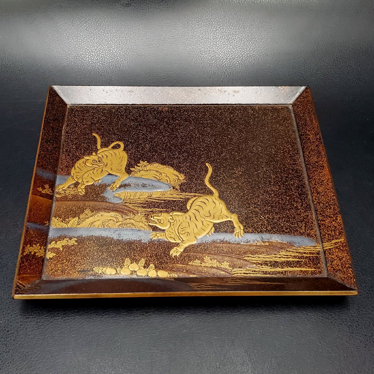【宝蔵】時代漆器 金銀盛蒔絵 遊虎之図 香盆 約21.5㎝×約18.5㎝ 権六識之 時代箱