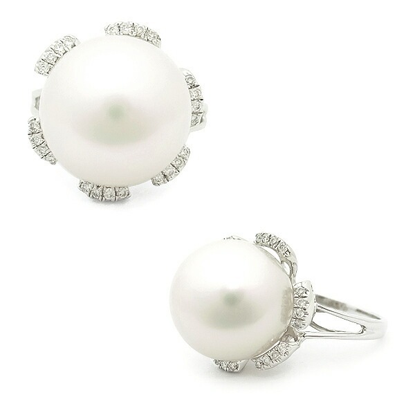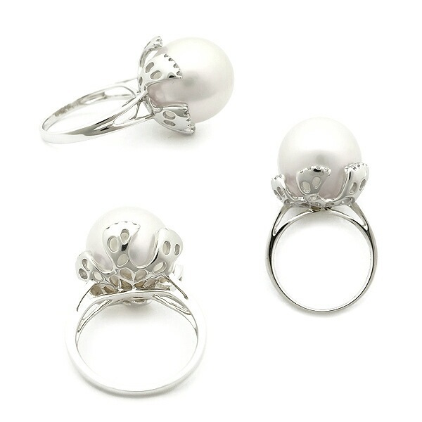 コメント 14.5mmの南洋真珠の華やかさが目を惹くリング。艶やかな光沢と美しい色彩を放つ大粒の白蝶真珠を4石ずつセットされたダイヤモンドのパーツで飾ったシンプルながらも存在感溢れるジュエリー。台座のオープンワークデザインによって、ボリュームがありながらも軽やかな印象に。カジュアルにもお着けいただける可憐なデザインが魅力です。