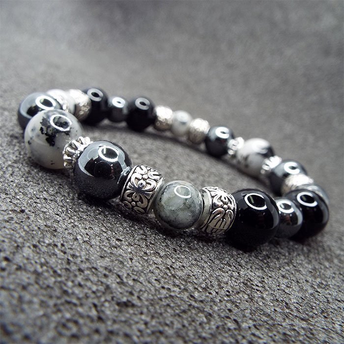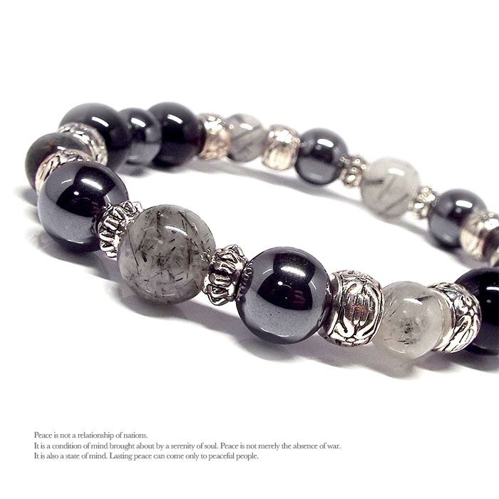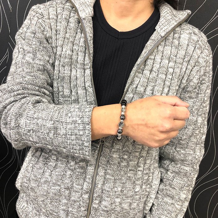 【STONE KITCHEN 天然石 パワーストーン】 ☆勉強運、仕事運、幸運・運気アップの魔よけ・厄除け・お守りブレスレット☆ ブラックルチルクォーツは直感力を高めるストーン!!! 人脈や仕事運に効果があります。 さらにブラックオニキスやヘマタイトを合わせて 悪運から身を守ってくれます♪ シンプルなデザインなので、時計やミサンガなど 重ねづけでの相性も抜群です♪ 誕生日やバレンタイン、クリスマス、父の日など 記念日のプレゼントやギフトにもおすすめです!! 内周:約17cm サイズ:ブラックルチルクォーツ 10mm・8mm ヘマタイト 10mm・8mm オニキス 10mm 1点 注意事項 ※金属部分は汗や汚れ等で変色する場合がございます。気になる場合は 金属磨きや布等で軽くふき取る事をおすすめします。 ※石の種類によっては、艶を引き出すことを目的として、ワックスや着色加工がされているものもあります。 ※表示のサイズは必ずしも最大値・最小値のサイズのものが入っているわけではございません。 ※天然石のため同じものでも色味・模様などが異なります。 ※照明の具合で実際とは色合いが異なる場合がございます。 また、天然素材特有のクラック・内包物を有する場合がございます。予めご了承下さい。 | |||