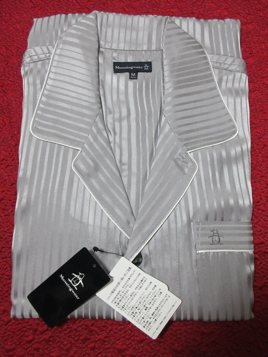 即決 タグ付き未使用 シルク100%パジャマ グレーストライプ Munsingwear オールシーズンメンズパジャマ M絹100 マンシングウェア