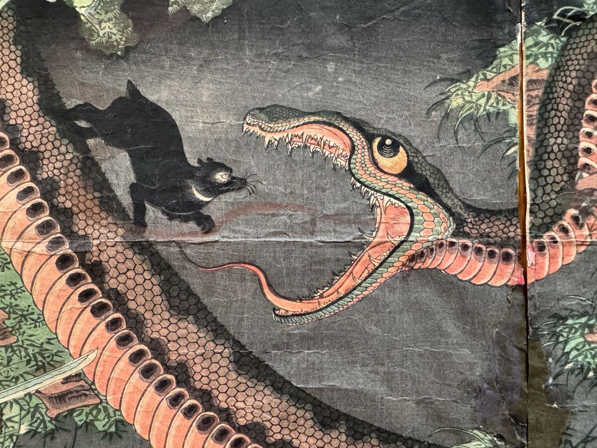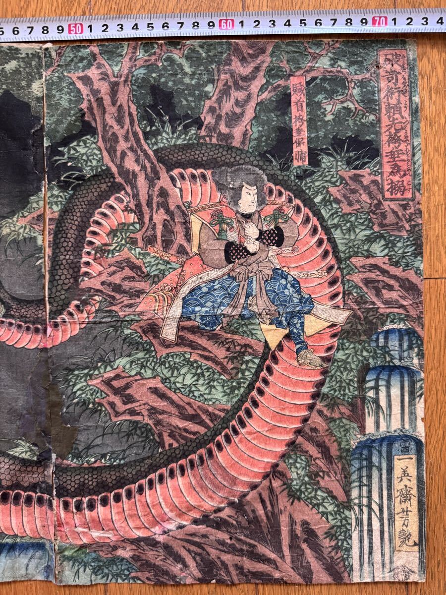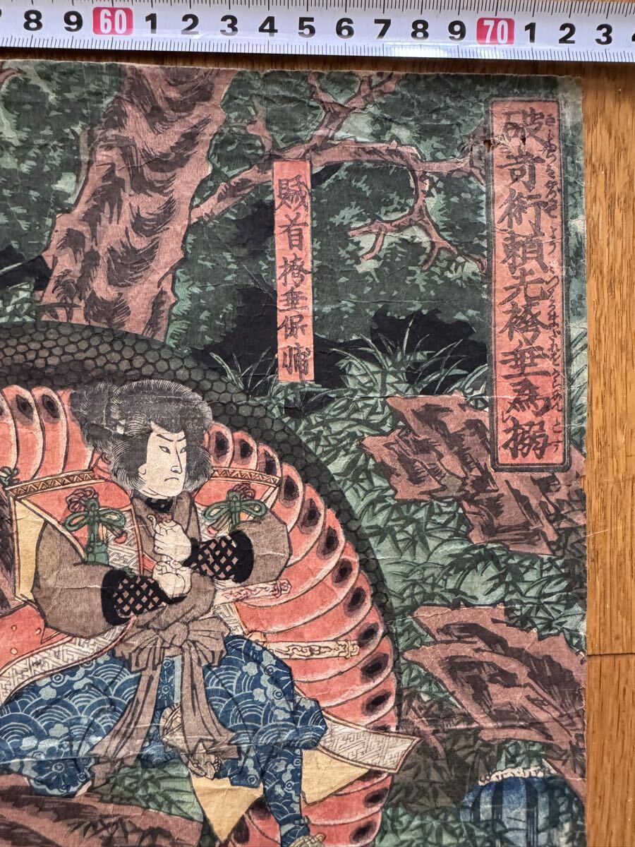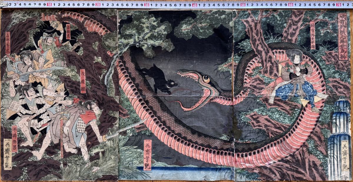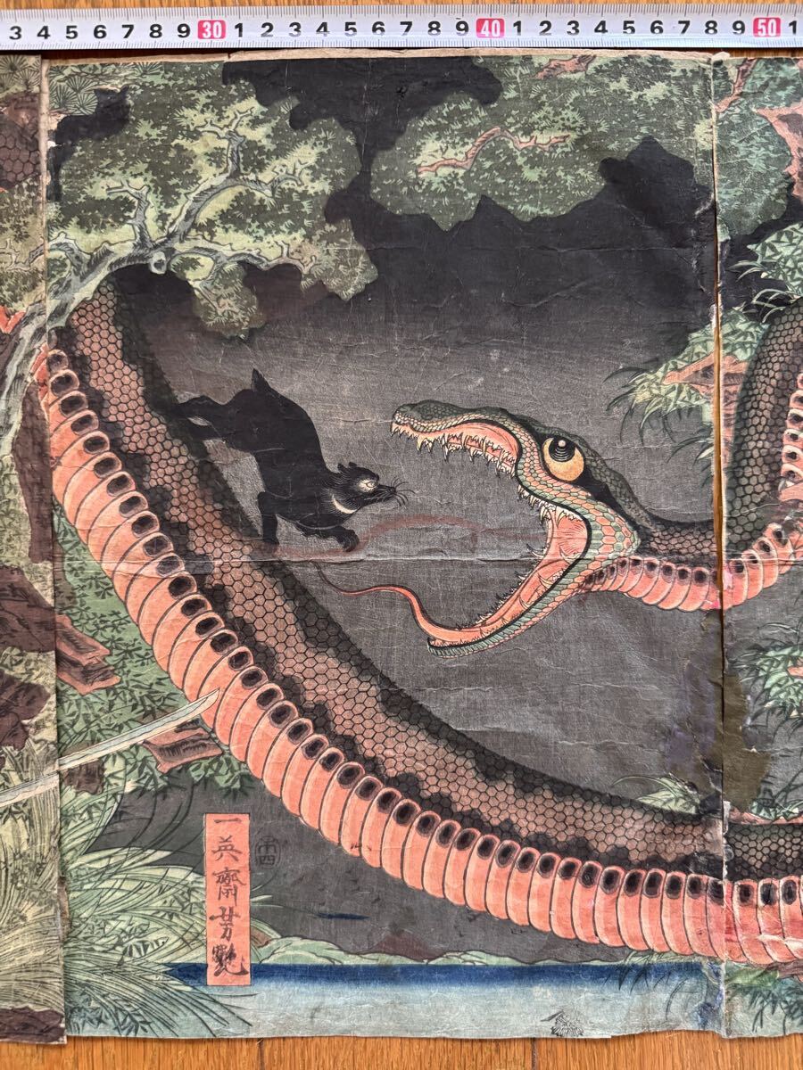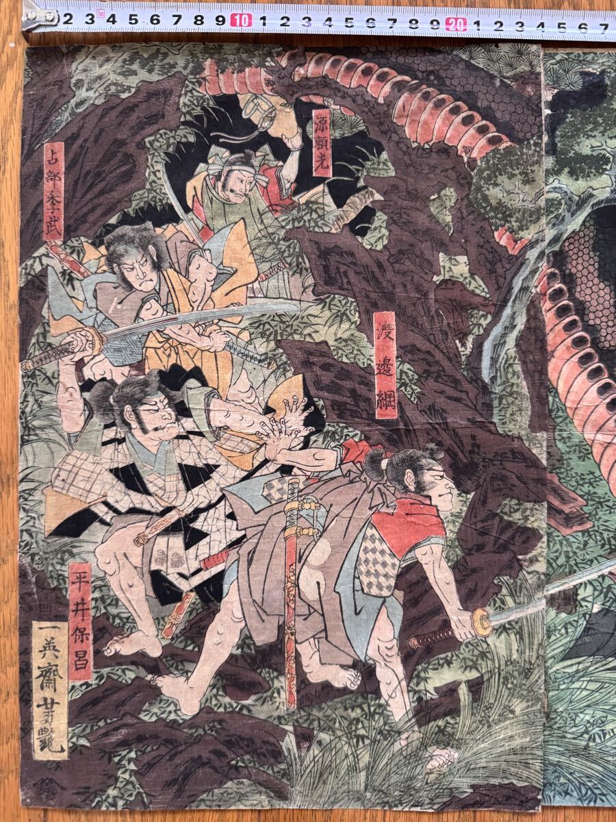 【真作】妖怪!本物浮世絵木版画 歌川芳艶「破奇術頼光袴垂為搦 賊首袴垂保輔」江戸期 大蛇 渡辺綱 平井保昌 武者絵 三枚続 錦絵 大判