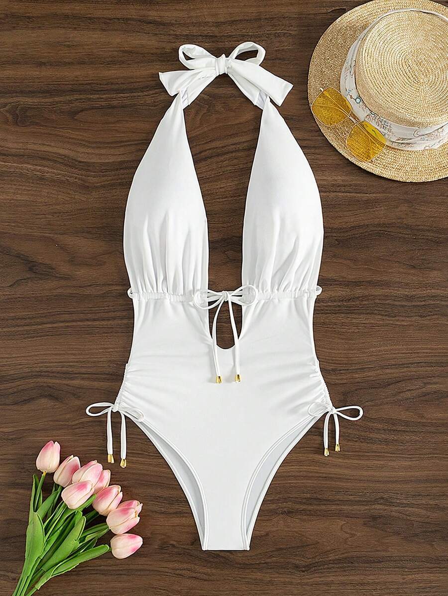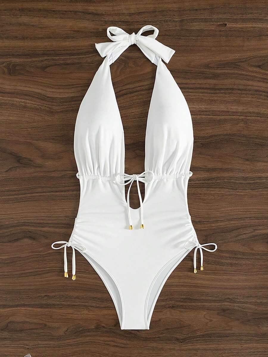 レディース 水着 ワンピース ドローストリングウエストとホルターネックのワンピース水着 ソリッドカラー 夏用 ビーチウェア