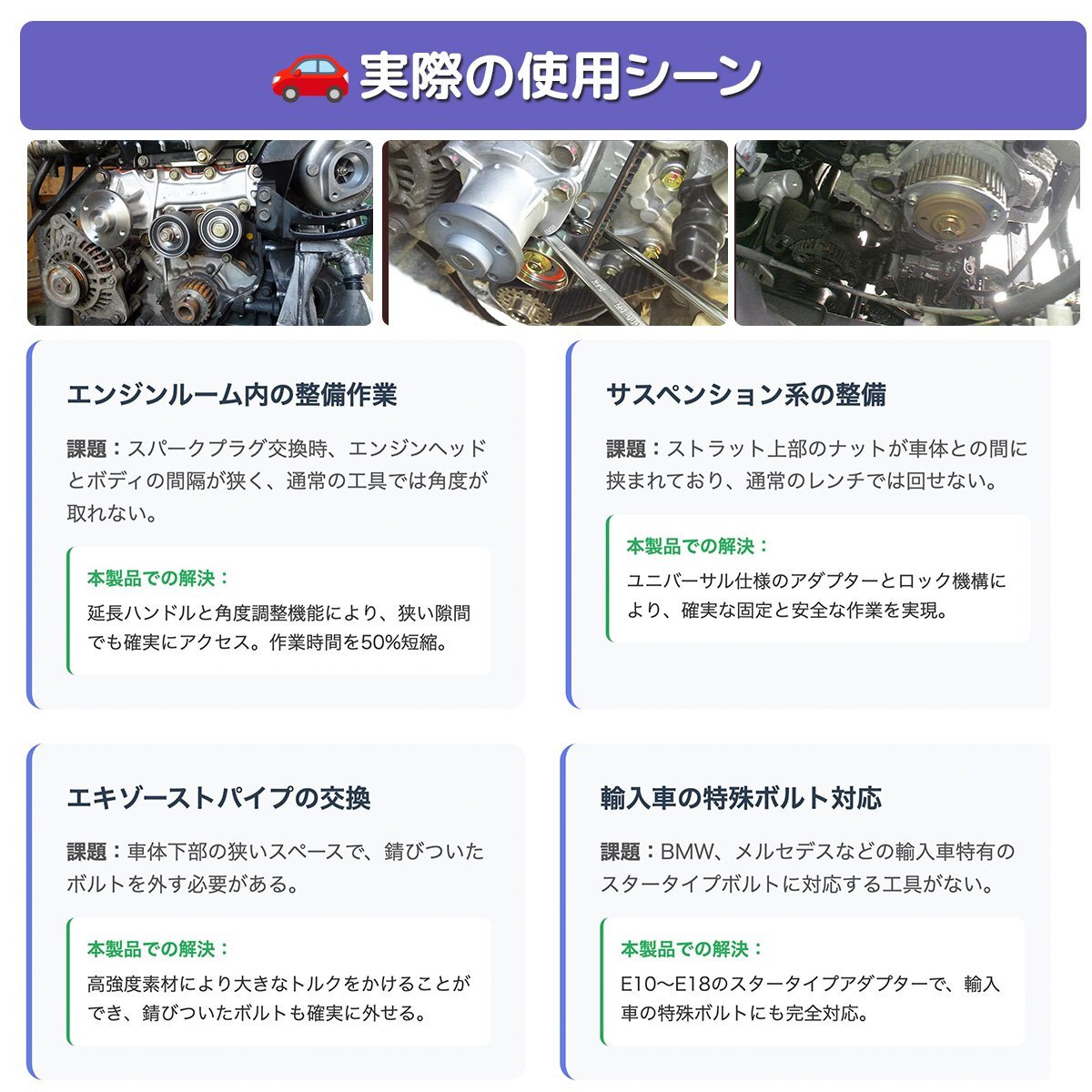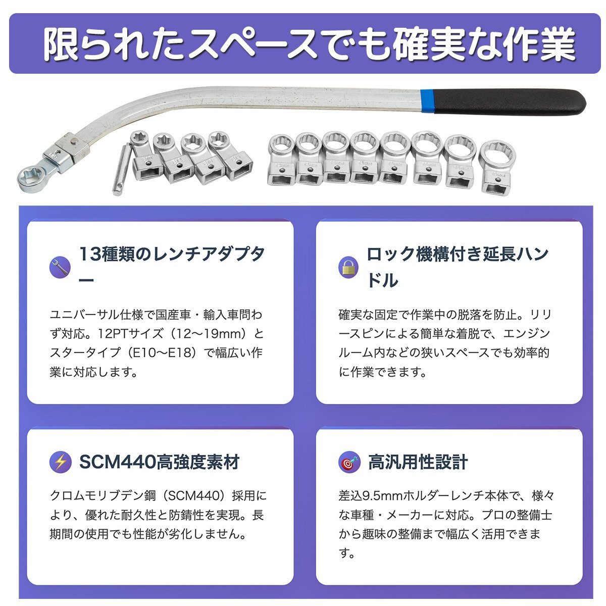 差込9.5mmホルダーレンチ本体で、様々な車種・メーカーに対応。プロの整備士はもちろん、DIYユーザーにも最適なマルチツールです。
