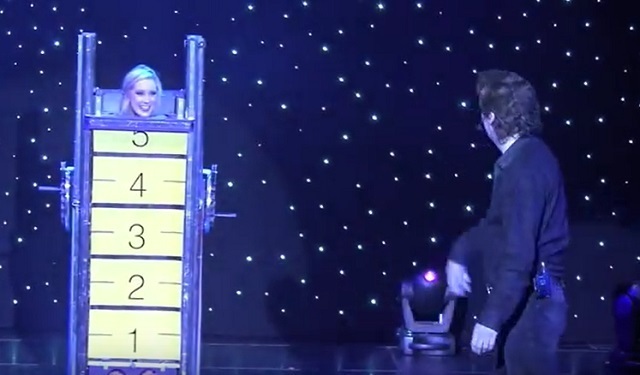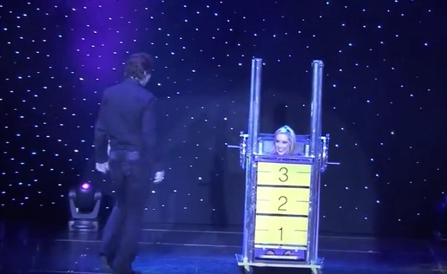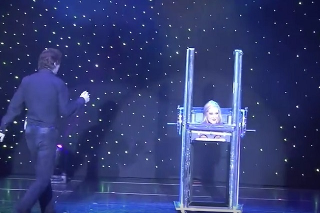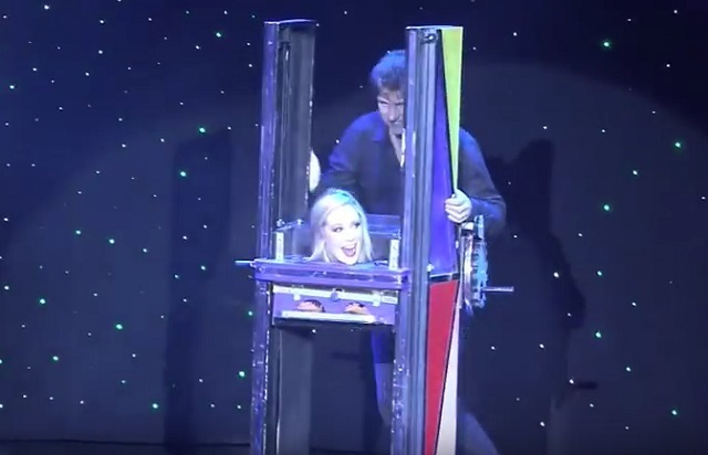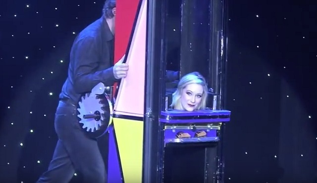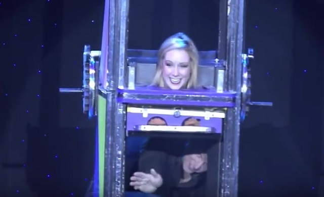 キャビネットの側面にある大きなクランクが回転し、彼女の頭と足が4インチ以内でキャビネットの中央に滑るように動きます。