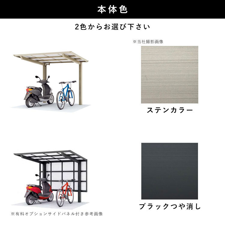 | カラー | 本体色:ステンカラー、ブラックつや消しの2色よりお選び下さい。 ポリカーボネート板屋根材色:グレースモーク |
