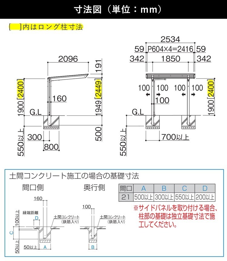 | 仕様・サイズ | 間口:2,096mm 屋根奥行:2,534mm 地面からの柱高さ:ハイルーフ:2,400mm 耐積雪:20cm相当 耐風圧強度:風速34m/秒相当 |