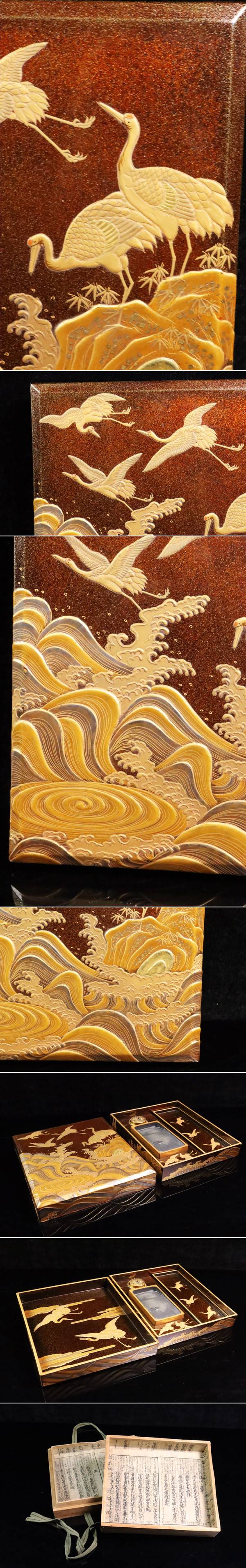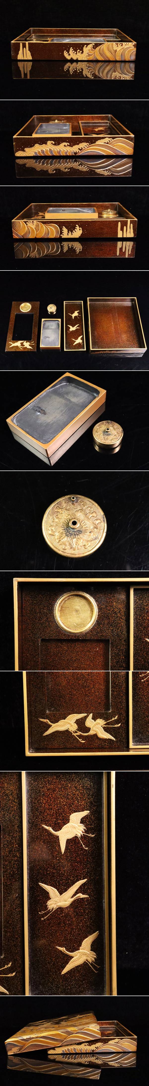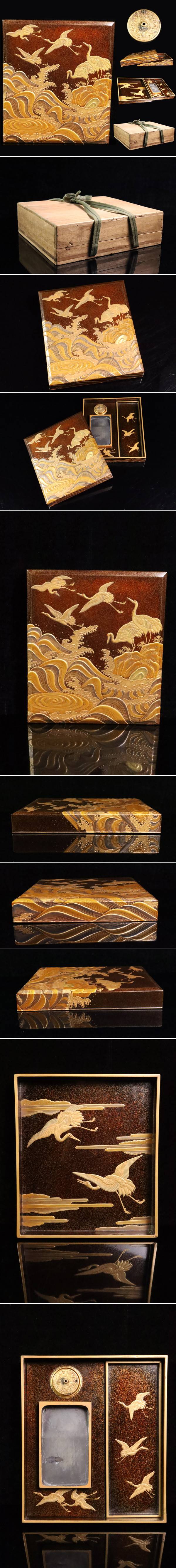 【櫻】時代漆器 総梨地 本金蒔絵 荒波文群鶴図 硯箱 時代箱 コレクター放出品 書道具同時出品中[74156qrp]
