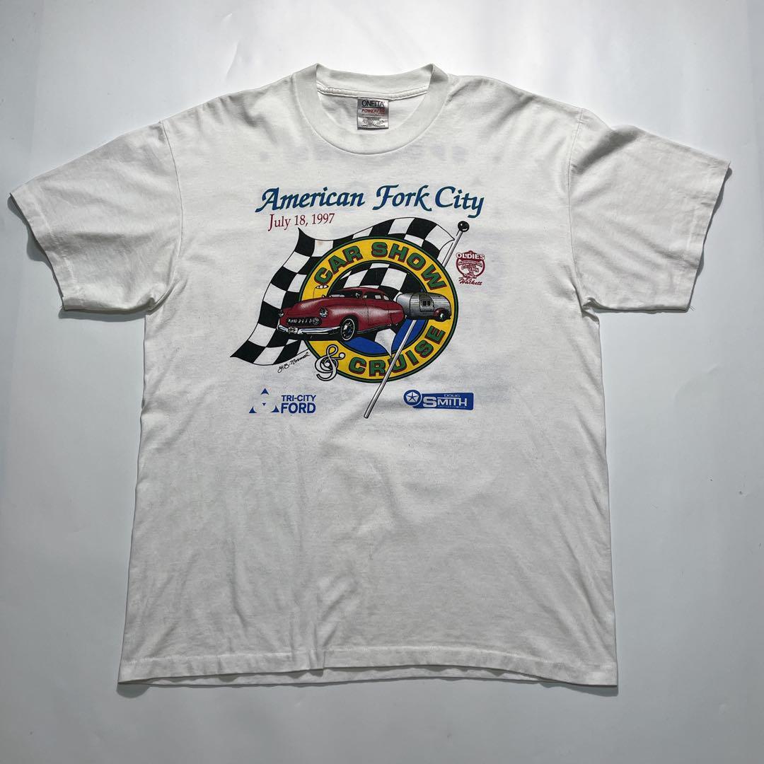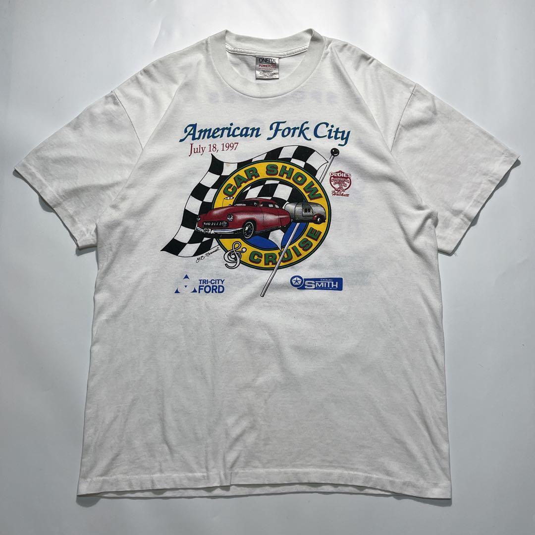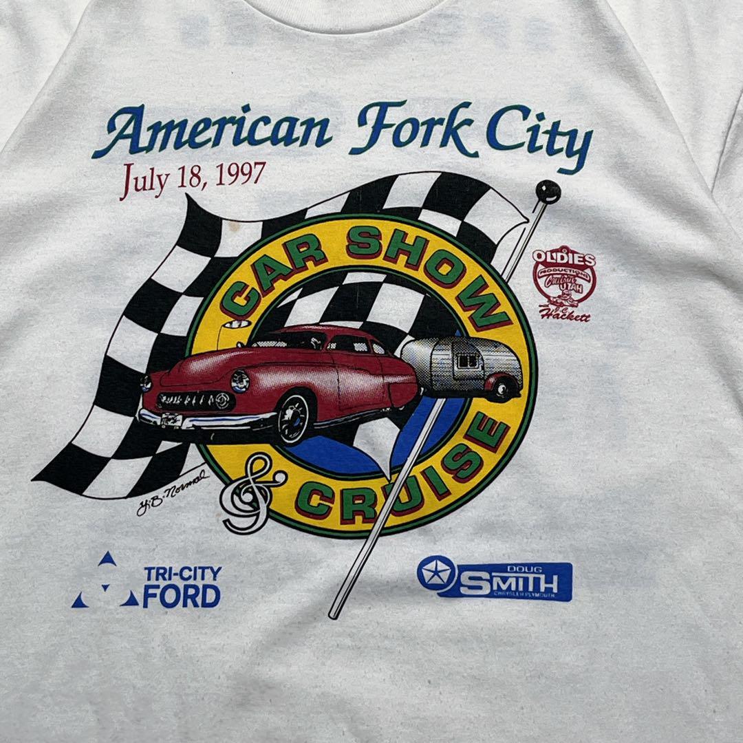 【USA製】で、フロントにはクラシックカーとチェック柄の旗がプリントされており、ヴィンテージの【カーショーイベントTシャツ】らしいポップなデザインが魅力的です。