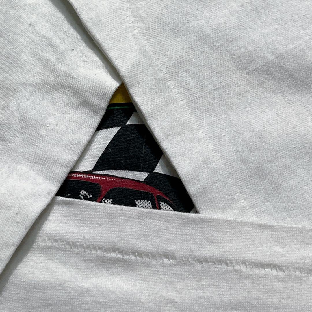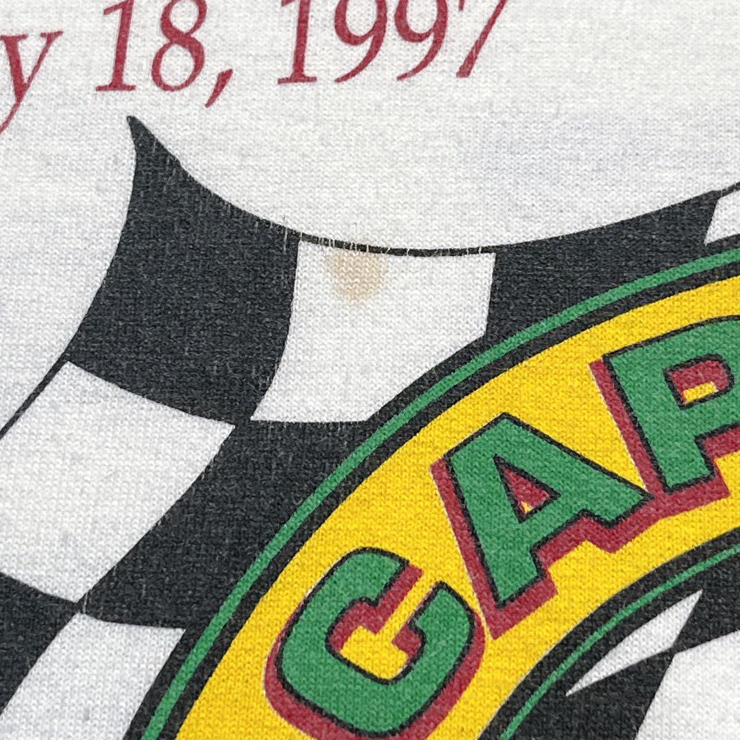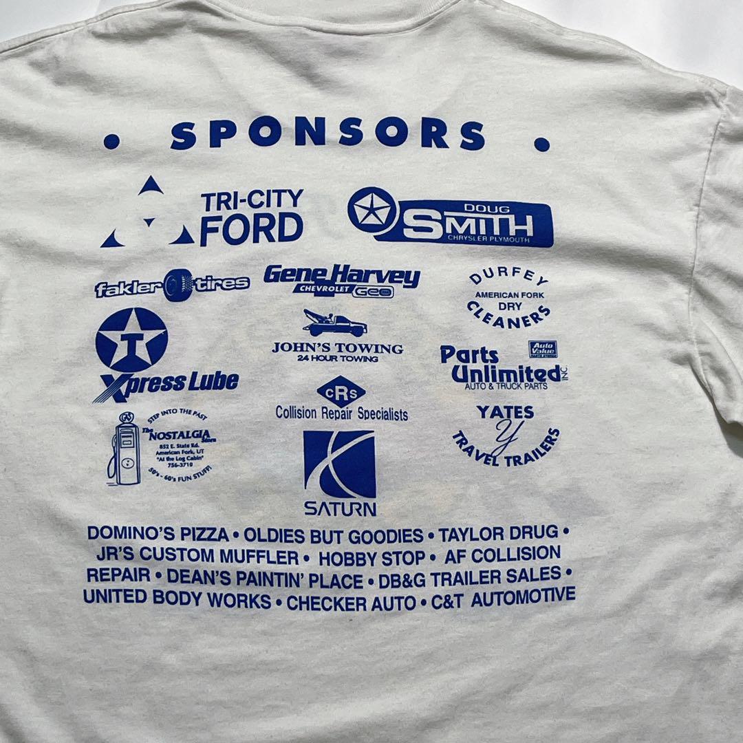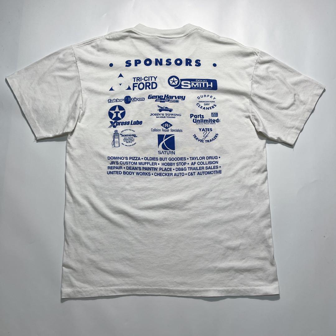 【USA製】で、フロントにはクラシックカーとチェック柄の旗がプリントされており、ヴィンテージの【カーショーイベントTシャツ】らしいポップなデザインが魅力的です。