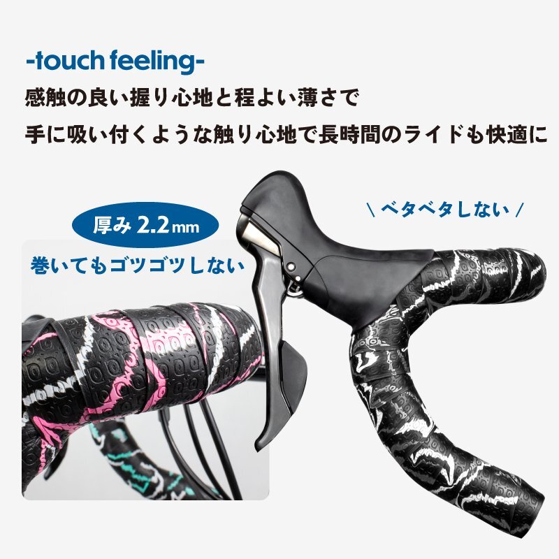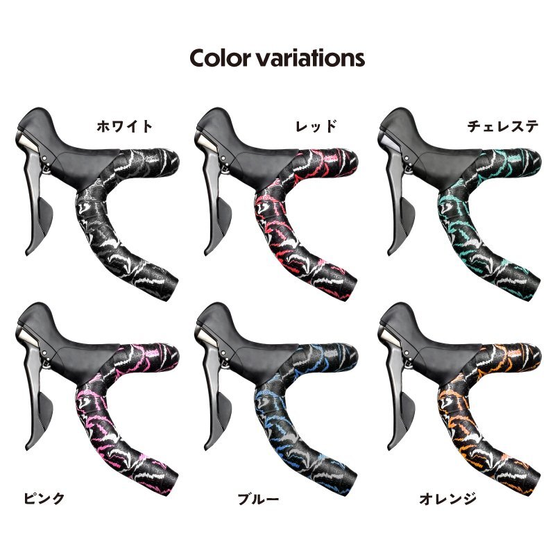 見た目にも印象が大きく変わるバーテープ。 機能性に優れ濡れた状態でも高いグリップ力を発揮! 伸縮性を残しつつ耐久性と強度を強化するためシリコンを配合。 タフで扱いやすい、また自転車のカスタマイズに適した柄デザインに仕上がっています。 [シリコン×PUレザー高い強度耐久性] 伸縮性高いPUレザーに強度は高く耐久性に優れているシリコンを配合しタフで扱いやすいテープに。 シリコンを配合する事で付着した汚れを落としやすい。そして伸ばしてもちぎれにくい(巻きやすい) [グリップ力] 雨や汗に濡れても優れたグリップ力を発揮し高いコントロール性を実現。 バーテープ表面には滑り止め加工が施してありグリップ力がさらに向上。 [感触] 感触の良い握り心地と程よい薄さで手に吸い付くような触り心地は長時間のライドも快適に。 厚み2.2mmでテープ表面はベタベタしない。 [衝撃吸収] 悪路やオフロードでの地面から受ける振動を抑える。 グラベルなどの未舗装路走行の自転車にも最適。 [柄デザイン] 個性を生かすマーブル模様でデザイン性高い柄。 見た目にも印象が大きく変わるバーテープで自転車カスタムも楽しめます。 [カラー豊富] ホワイトやレッド、ブルーの定番カラーから根強いカラーのチェレステやピンク、オレンジカラーも取り揃えています。 [固定式エンドキャップ] 紛失しにくく使い易いタイプのエンドキャップを採用。 綺麗でおしゃれなオイルスリックカラー。 先端技術のCNC加工法で作成し、頑丈で耐久性に優れています。 商品内容バーテープ、エンドキャップ、エンドテープ サイズ厚み2.2mm×長さ2150mm 材質表面PUレザー+シリコン、裏面EVA | |