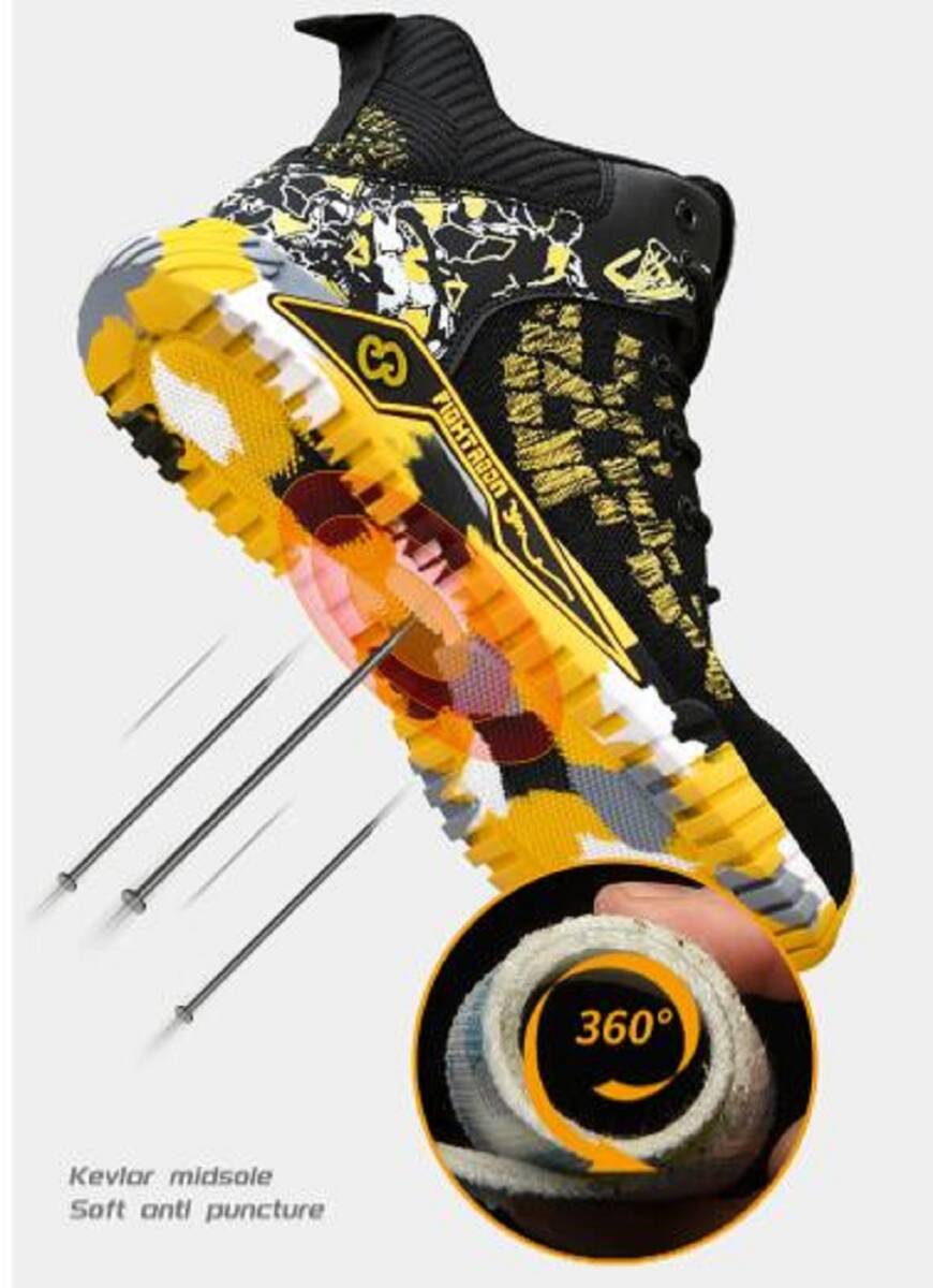 【安全第一】安全靴のつま先部分には鋼先芯を入れた、危険をはらんでいる作業場に刃物や重量物の衝撃から足を守ります。ケブラー中底を採用して、釘から足をしっかり守ります。