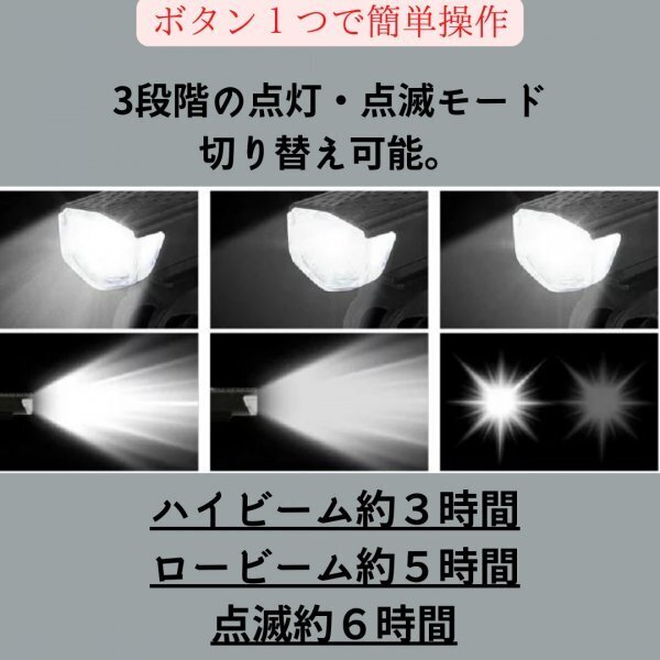 ON/OFFボタンを押すと、明るい・弱い・点滅の3段階モードを切り替えることができます。最大光量で2.5時間、弱は4時間、フラッシュは12時間ご使用いただけます。(製造元データ参考)