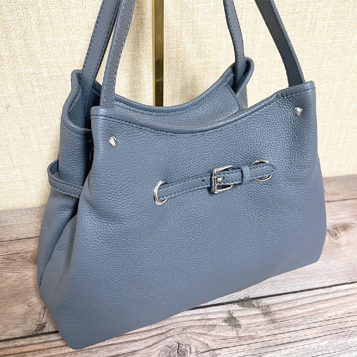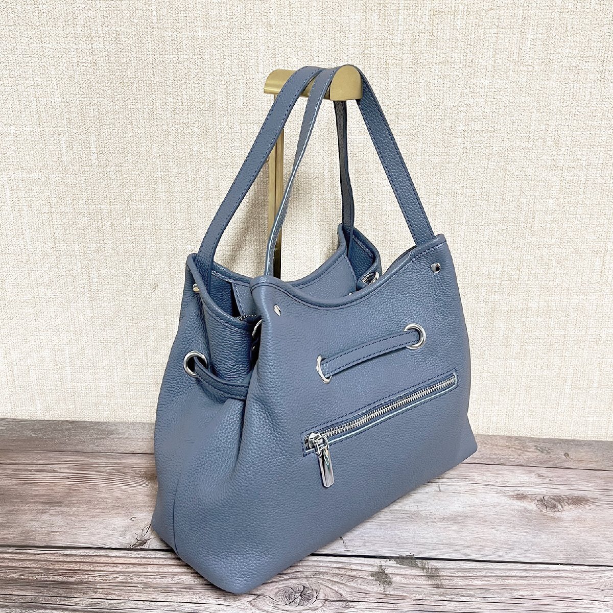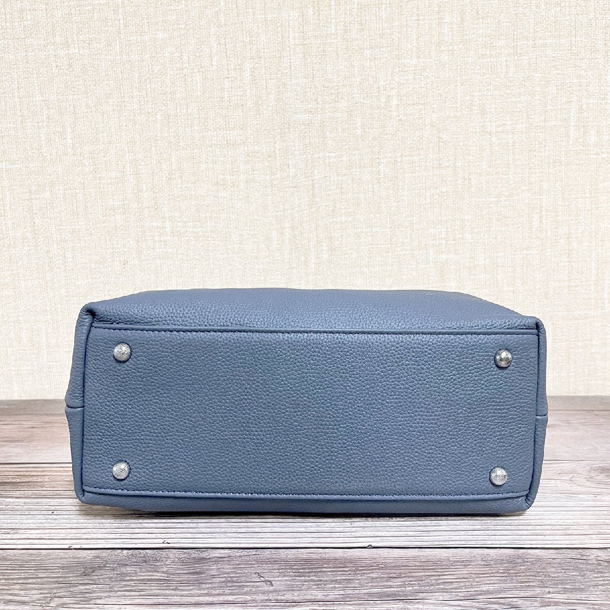 バックの底に鋲が4つ付いております、直置きでも傷や汚れからバックを守ります。サイズが大きすぎず小さすぎず、財布やキー、折りたたみ傘、モバイルバッテリーやタブレット等必要なものがちょうど収まります。ショルダーベルトが付いており、長さ調整できるなので、ハンドバッグとショルダーバッグとしてもお使い頂けます。裏面でファスナー付きポケットが付き、スマホ、カード、鍵、口紅などよく使う小物が整理できて便利だけではなく防犯もできます。