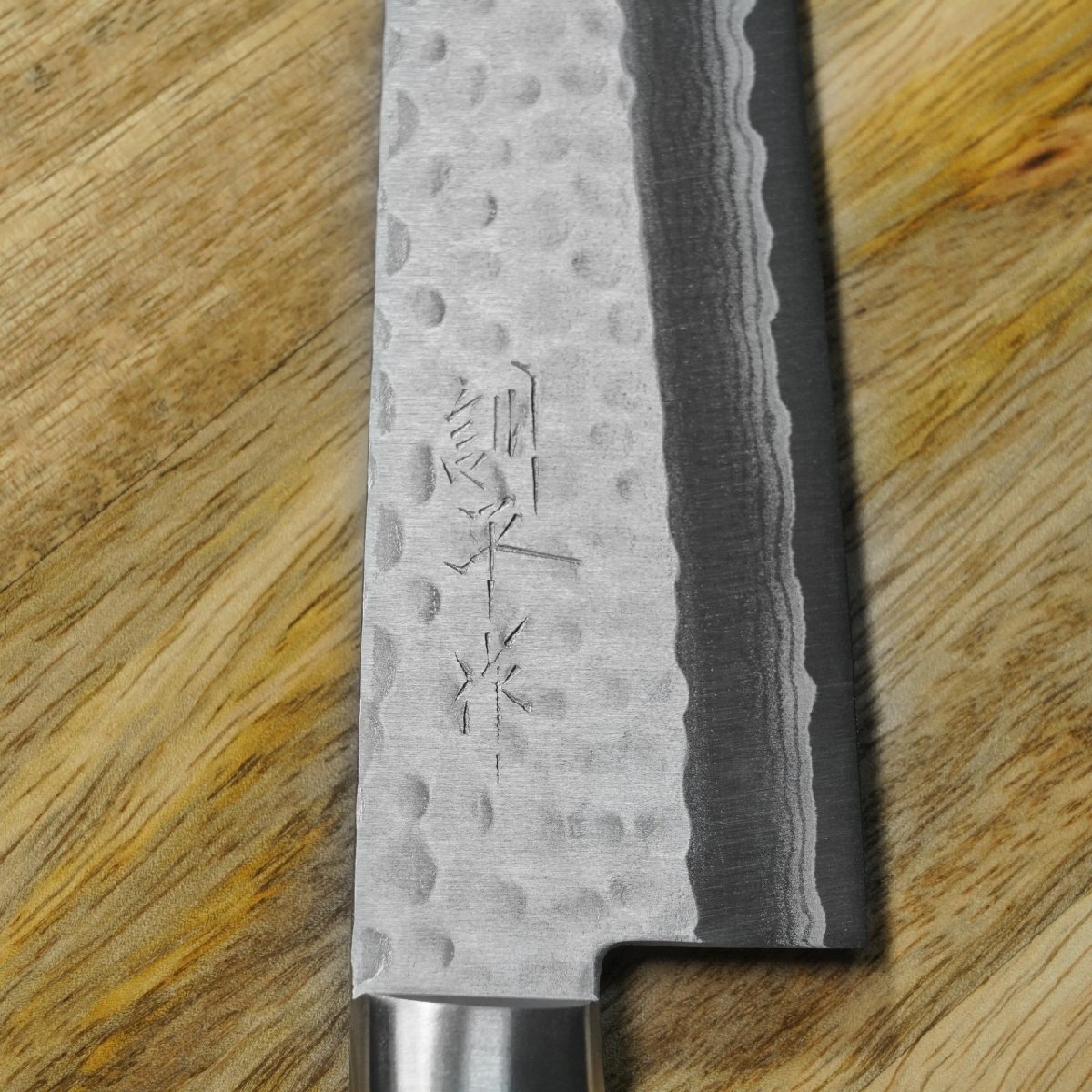日本刀の技術で知られるように、柔らかい鋼材と硬い鋼材を重ね合わせ、素材を鍛えることにより、非常に優れた刀身が生み出されます。その結果刀身に生じる「墨流し」と呼ばれる優美な波模様は、日本の刃物文化が生み出した宝の一つです。刀身を鍛えた結果生じる模様であり、ひとつとして同じ模様は存在しません。刃先に鉄粉を吹き付け、刃先の刃模様を浮き出させる作業を一本一本手作業で行っています。