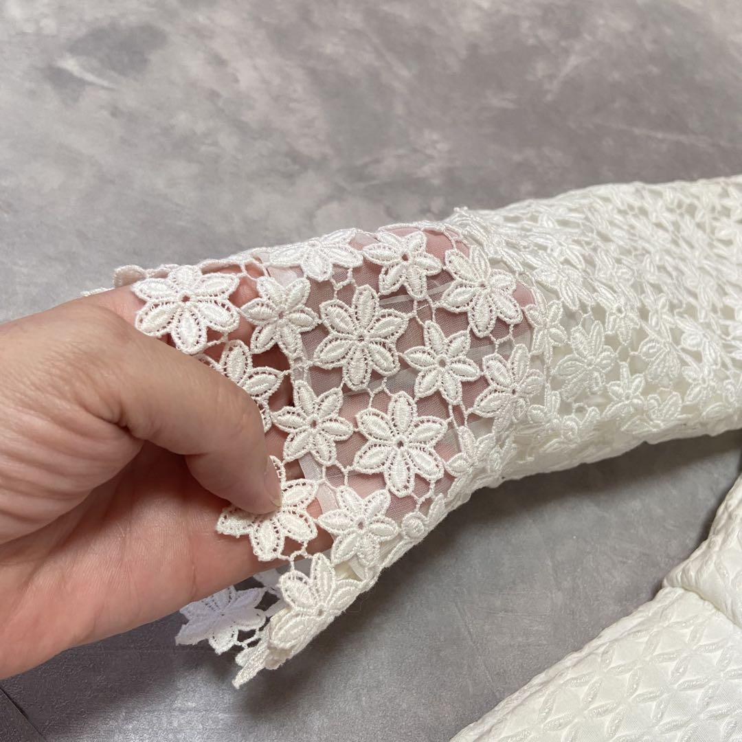 立体感のあるジャガード織り生地に、フラワーレースの七分袖を合わせたフェミニンなデザイン。