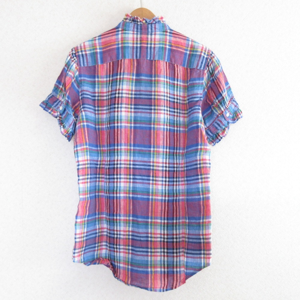 美品 Polo Ralph Lauren ポロラルフローレン チェック柄 半袖 バンドカラー フリル リネンシャツ 6 マルチカラー