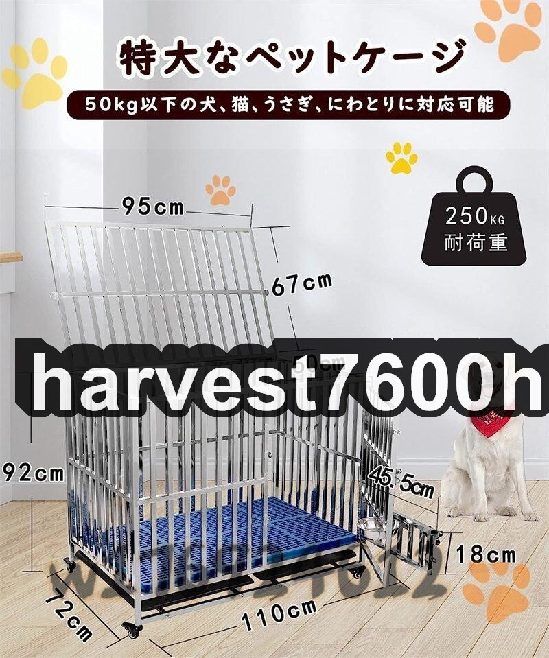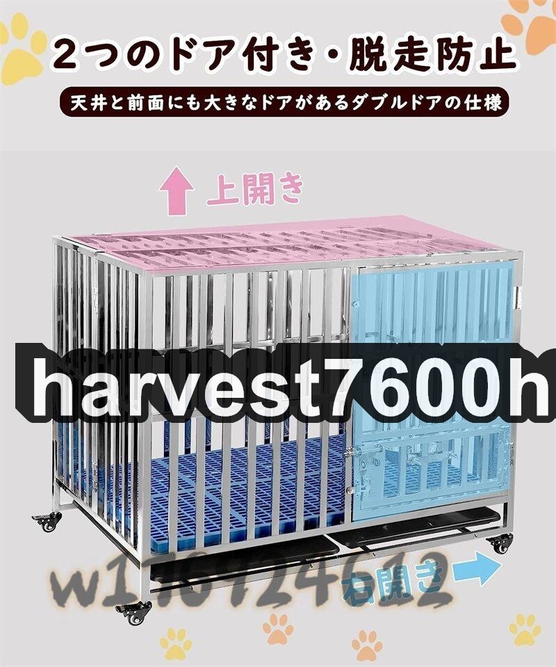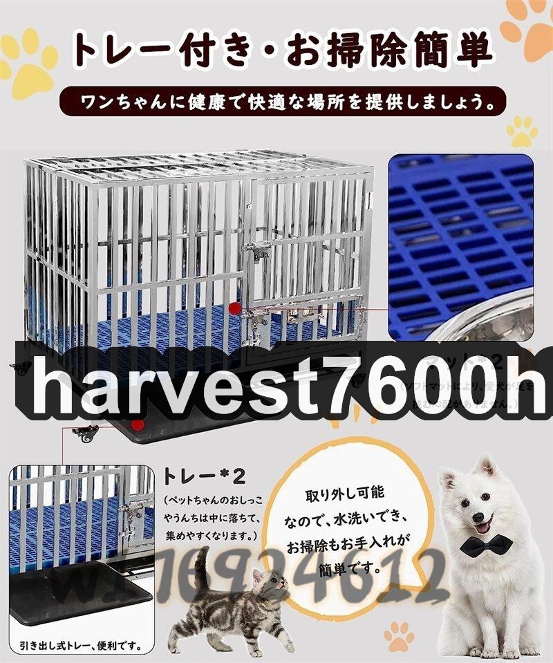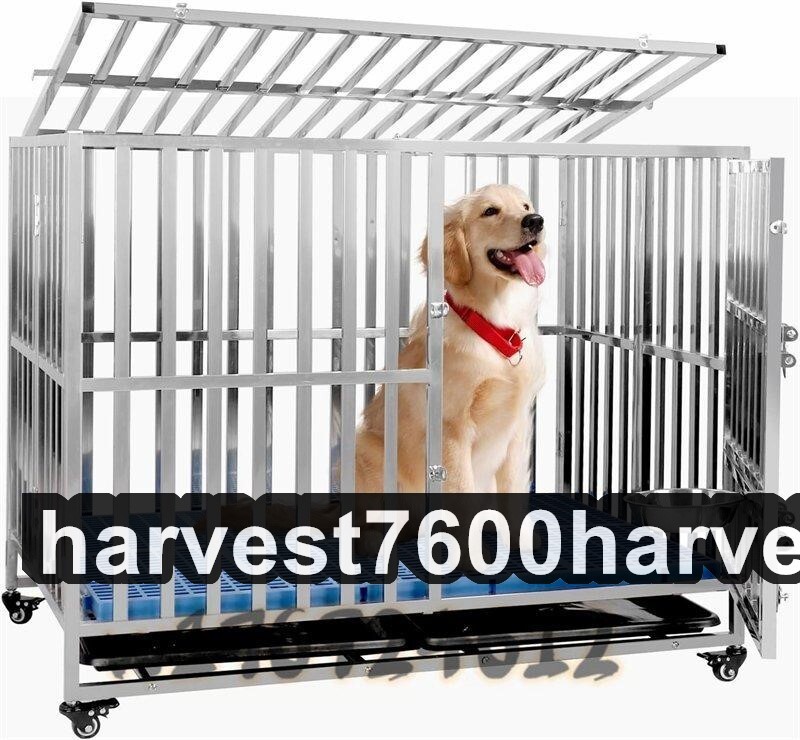 良い品質☆犬用ケージ ステンレス鋼製 キャスター付き 耐荷重250KG 折り畳み式 ダブルドア/トレー/マット/給餌器付き 110*72*92cm