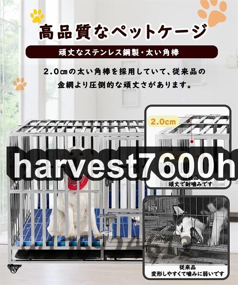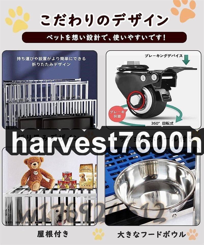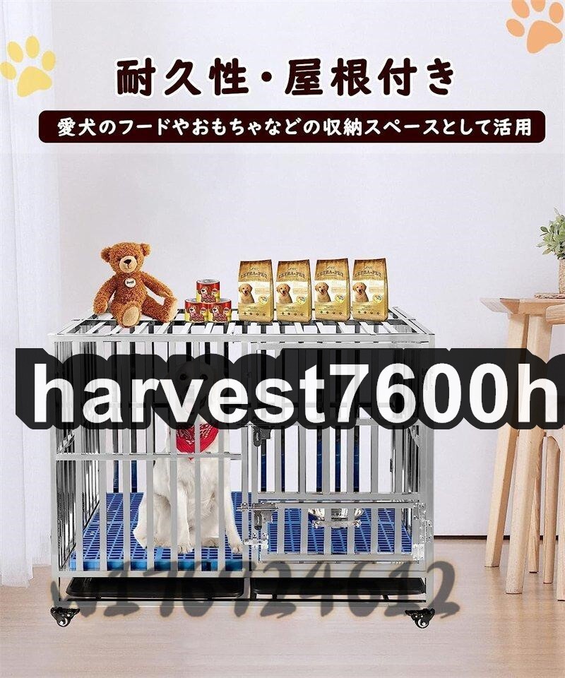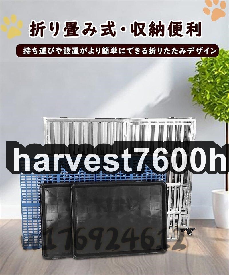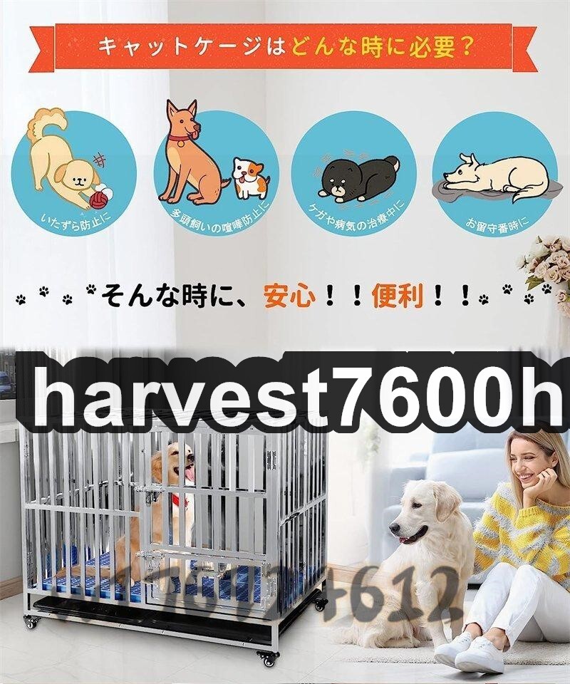 ★状態:新品未使用 ★状態:新品未使用 【ワンちゃんが安心できる場所】キャットケージはどんな時に必要?犬がお留守番時に危険防止やいたずら防止に、多頭飼いの喧嘩防止に、ケガや病気の治療中に、飼い主様のお食事中に、窓を開けて換気したい時に、ワンちゃんが安心できる場所をつくることはケージの利用がおすすめです。 【広いスペース・快適な大型サイズ】110*72*92cmの特大なペット用ケージで、50kg以下の犬、猫、うさぎ、にわとりに対応します。遊ぶスペースを確保し、成長期の犬を飼っている方や、将来的に家族が増える予定がある人にもスペースも広くて便利です。犬小屋は大きいですが、折りたたみ式なので、組み立ても設置も簡単です。 広げて底面のパーツを入れるだけで、すぐに使えます。 【耐久性・安全・高品質なペットケージ】ケージフレームは、頑丈なステンレス鋼が採用されていて、角棒の幅が2.0㎝でもあり、100kgの重量にも耐えられ、ほとんどの犬の噛みに対応できます。耐久性と耐腐食性に優れたので、非常に長持ちします。ケージの屋根の耐荷重にも強くては、愛犬のフードやおもちゃなどの収納スペースとして活用できます。おオシャレでシンプルなデザインでどんなインテリアにもマッチします。 【2つのドア付き・使いやすい・脱走防止】天井と前面にも大きなドアがあるダブルドアの仕様で、飼い主がペットにエサやりやペットとのふれあいがしやすくなります。また、ケージ(犬小屋)としてもサークルとしても使えるので、別にサークルを用意する必要はありません。こんな多機能ケージがあるなんて、お金も手間も省けますよね。 【ロック式とホイール付き・安定性・移動便利 】4つの高品質なキャスターが付いているので、室内から室外への移動や部屋の掃除をするときなどに簡単に移動可能です。 さらに、車輪をロックすることができ、ケージの安定性をさらに高めています。 犬がその中で遊んだり、歩き回ったりしても、車輪が動くことはありません。また、 直径16.5cmの大きなフードボウルが付属しているので、愛犬はその中で食事をすることができます。ケージ内にペットを入れておくことができるので、安心して外出できます。 【トレー付き・マット付き・お掃除簡単】ペットちゃんのおしっこやうんちが速やかに掃除されないと、生活環境が臭くなったり、細菌が繁殖しやすくなったりします。愛犬の健康に影響を及ぼすこともあります!このケージは取り外し可能なトレイ2つ、プラスチック製のマット2枚が付属しているので、水洗いでき、お掃除もお手入れが簡単です。底面のソフトマットにより、犬の前足が金属に直接触れる必要がなく、足がとても楽に感じられます。 飼い主は、愛犬が手を挟む心配がありません。