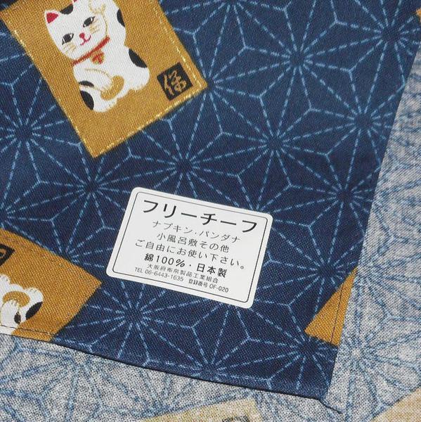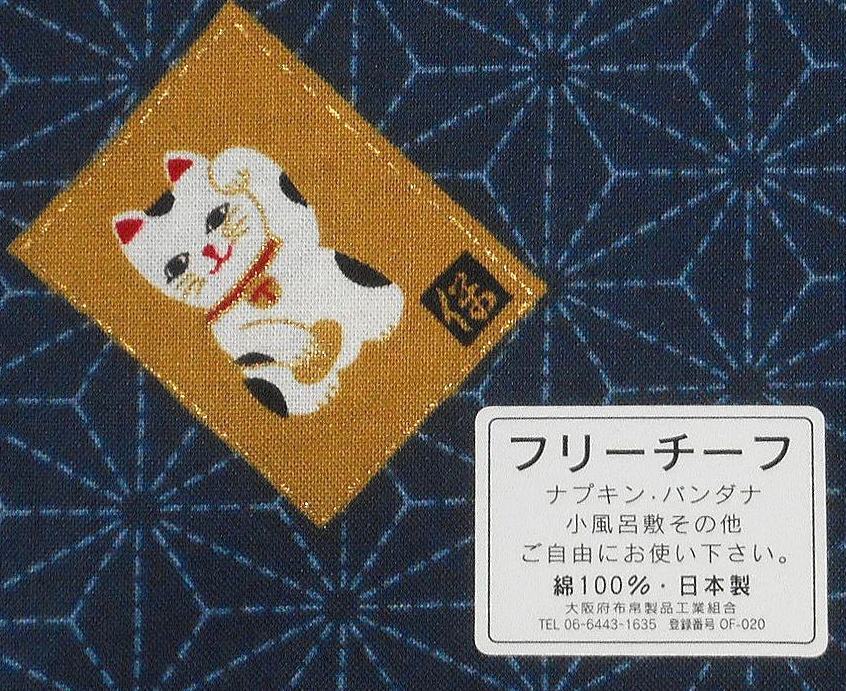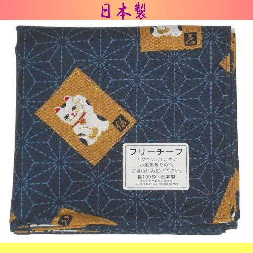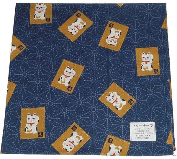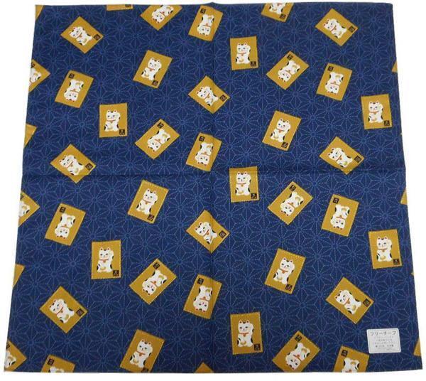 日本製◆開運招福★和がら*バンダナ◆ネコ CAT =^_^= ¥ 招き猫 ★青紺色 ネイビー■53×53cm■綿100%■ コットン・チーフ*小風呂敷