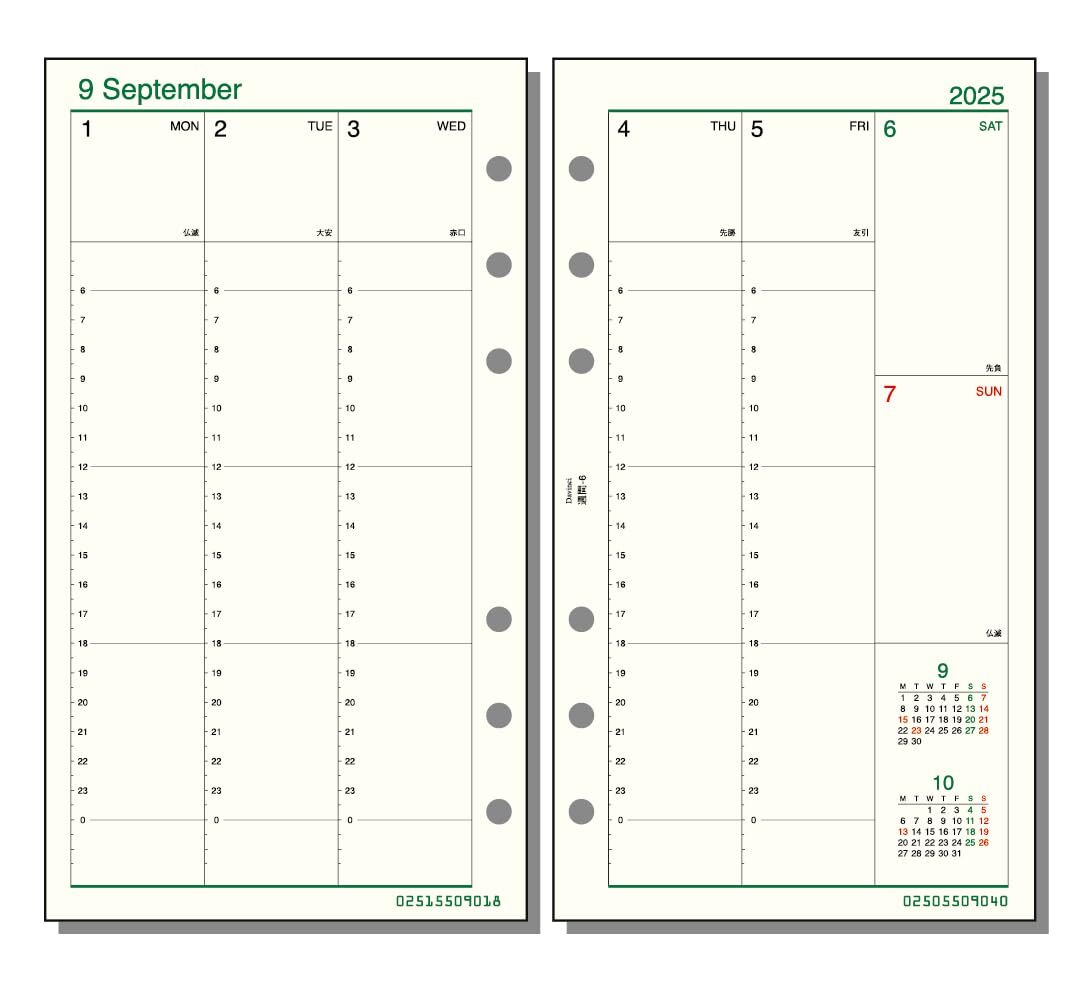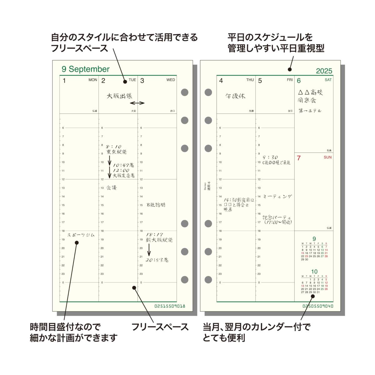 【2025年日付入りダヴィンチブランドシステム手帳リフィル】 見開き両面1週間 時間目盛付 縦型平日重視 日付入。 縦型時間目盛付なので時間ごとのスケジュール管理がしやすくなっています。 1分 2024年12月~2026年3月 【手帳専用紙 トモエリバー使用】 厚くなりがちなシステム手帳を薄くスマートに管理するために、薄いリフィル用紙を採用。 もちろん、ただ薄いだけではありません。 新聞紙にコピー紙とダヴィンチリフィルを並べて置いてコピーをとってみて下さい。 コピー紙を置いた新聞の文字は、はっきり読めるのに比べ、ダヴィンチリフィルは、ほとんど透けて見えません。 インクの裏抜け、透け感が、一般の用紙に比べて遥かに優れたリフィル専用紙トモエリバーを使用しているからです。 商品名:レイメイ藤井 手帳 システム手帳 リフィル 2025年 バイブルサイズ ダヴィンチ 週間6 ウィークリー DR2516 2024年 12月始まり