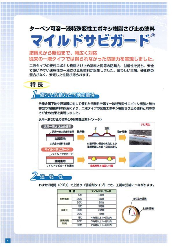 二液タイプの変性エポキシ樹脂さび止め塗料と同等の防錆力、付着性を持ち、安全で使いやすい速乾性の一液さび止め塗料が誕生しました。煩わしい主剤、硬化剤の混合がなく、安定した性能が得られます。