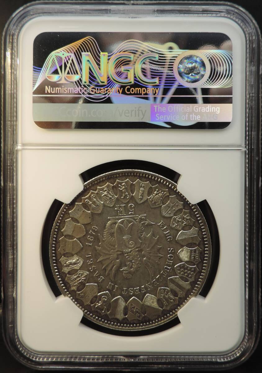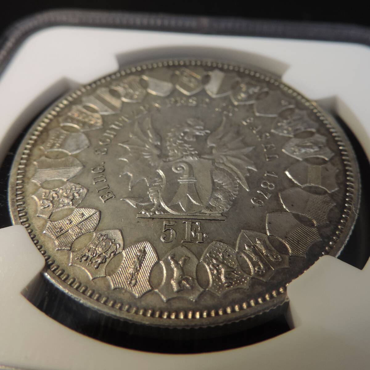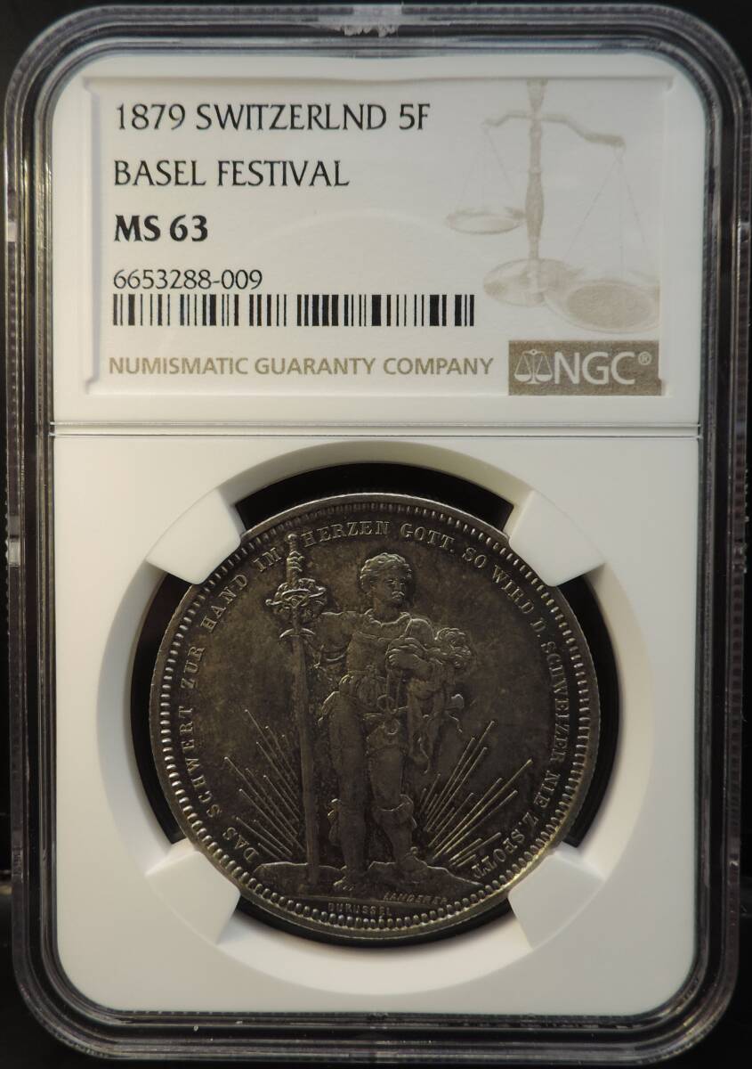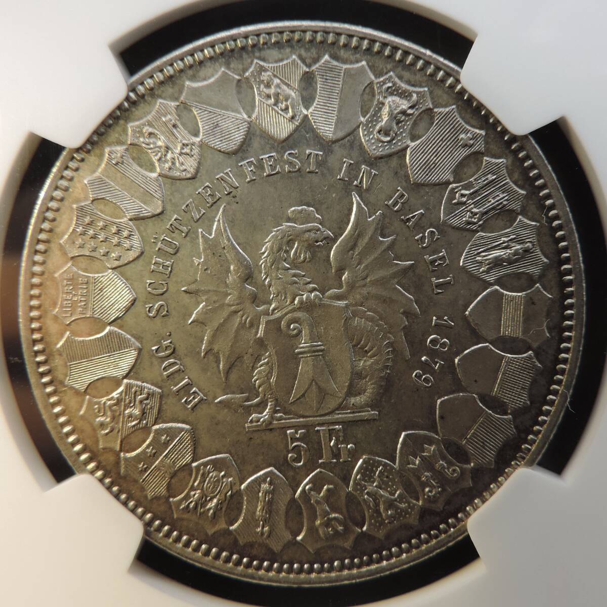 【高鑑定 MS63】1879年 スイス バーゼル 射撃祭 5フラン銀貨 NGC MS63 レインボートーン バジリスク アンティークコイン #234