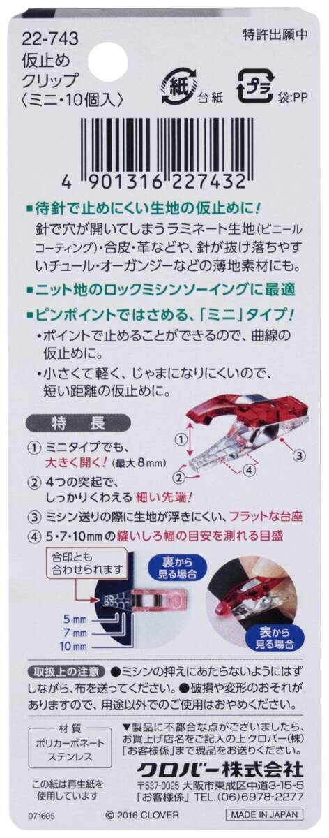 【新着商品】ソーイング用品 Clover 仮止めクリップ ミニ 10個入り 22-743 ピンク