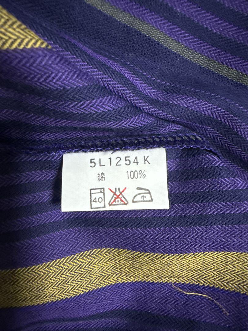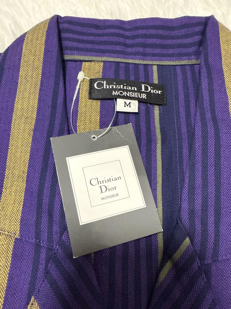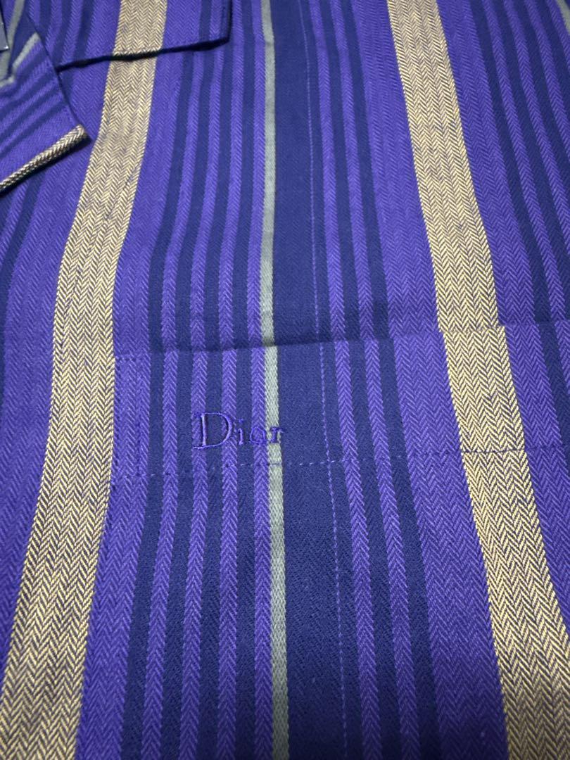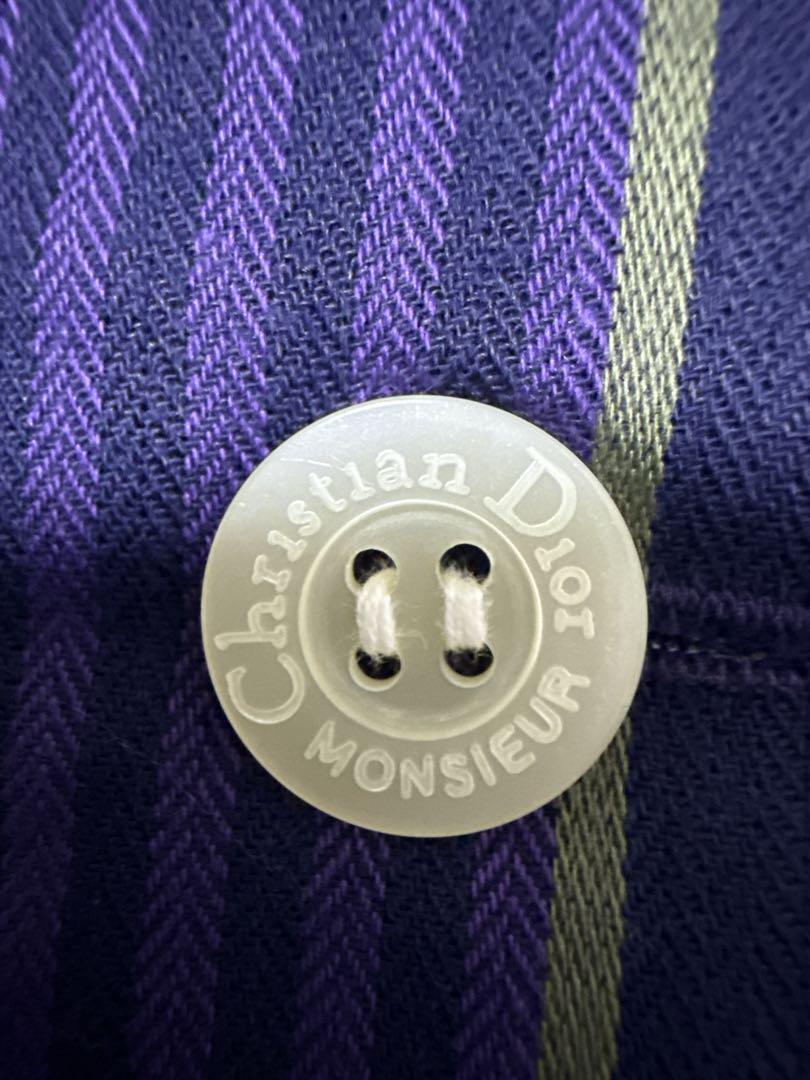 パープル×ベージュのストライプ柄がヴィンテージらしい洒落感を演出し、胸元の“Dior”刺繍や刻印入りボタンなど細部にまでこだわりが感じられます。