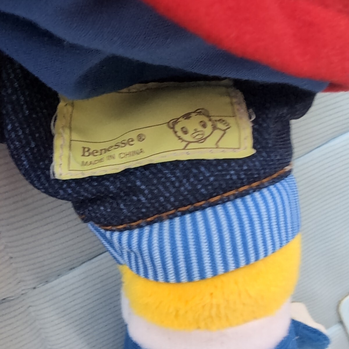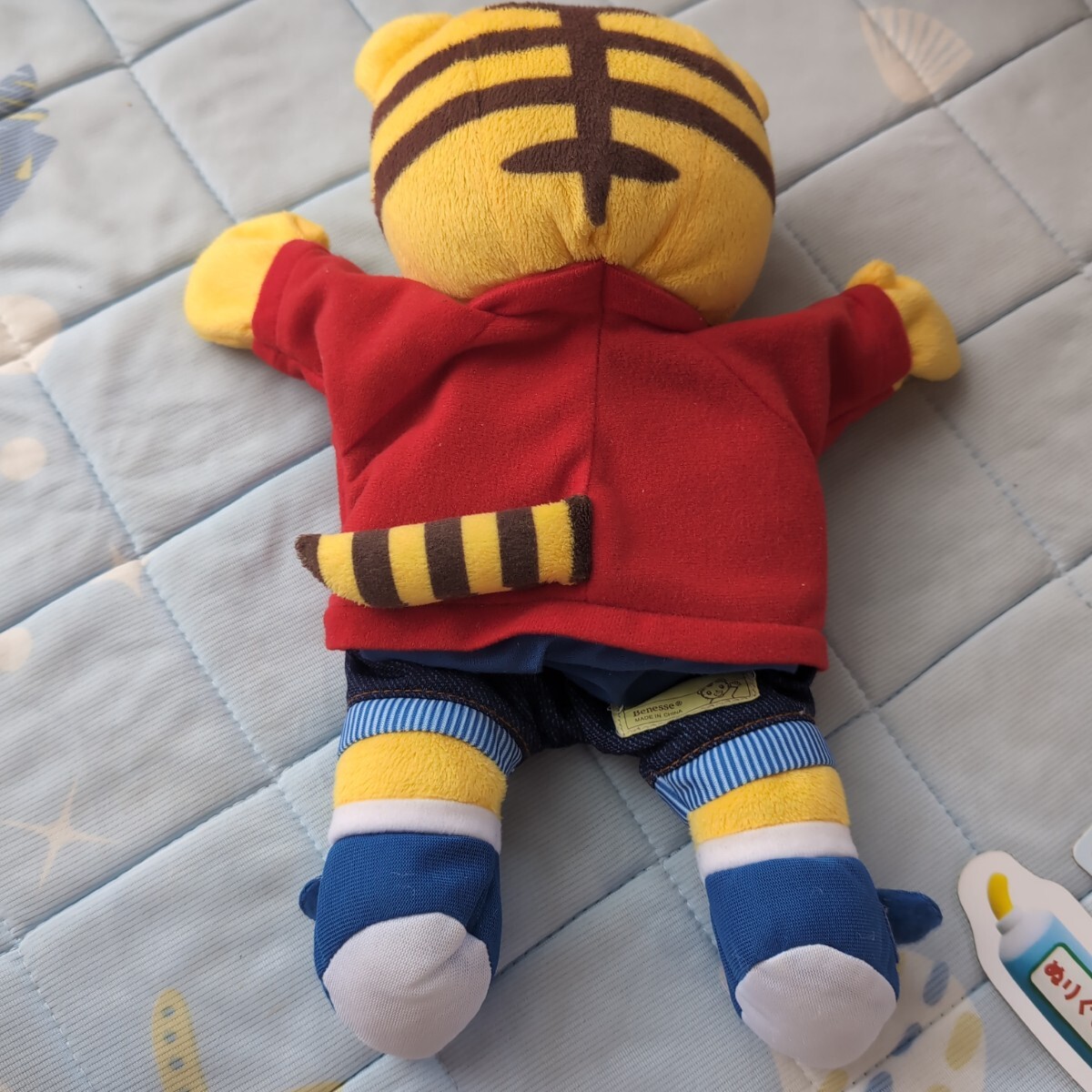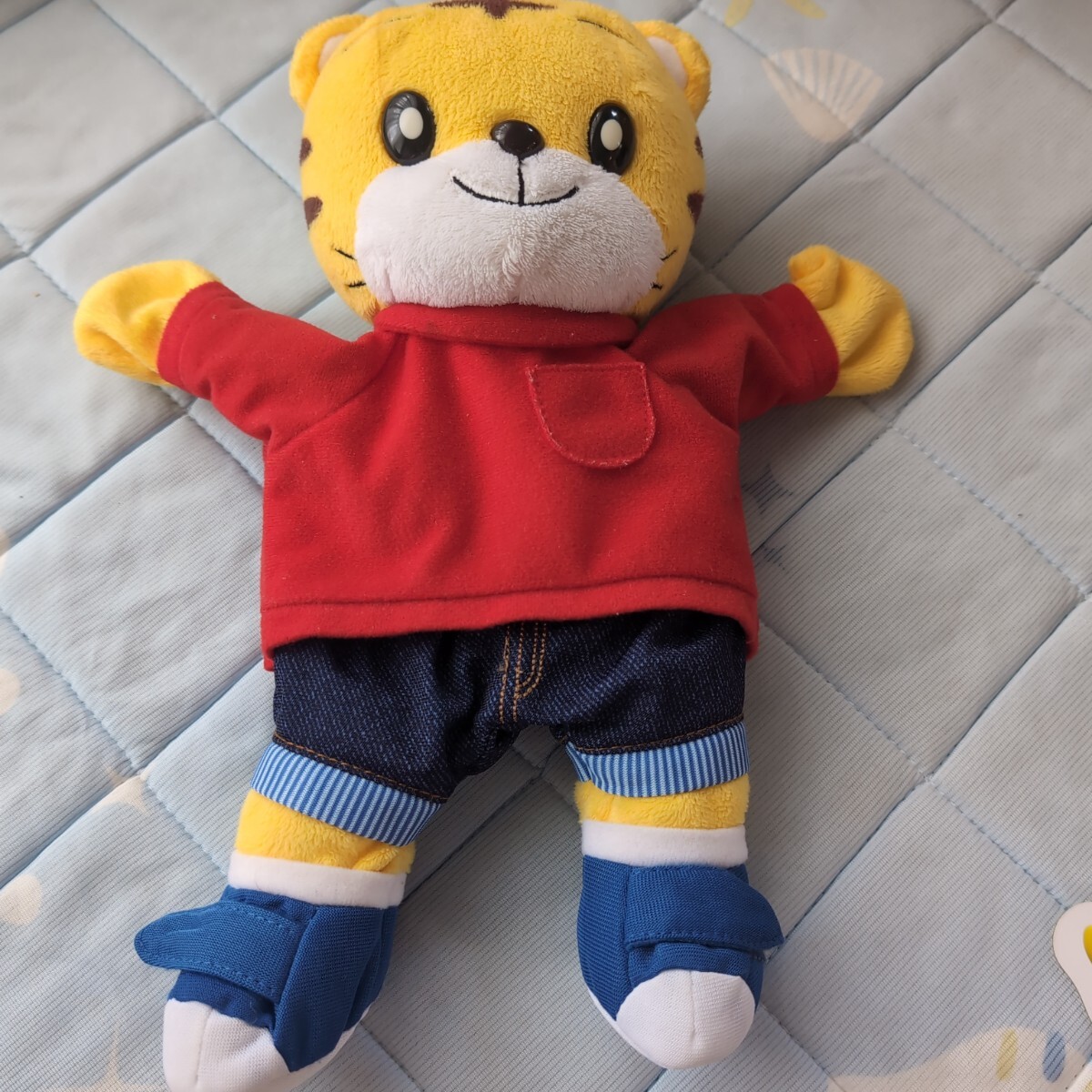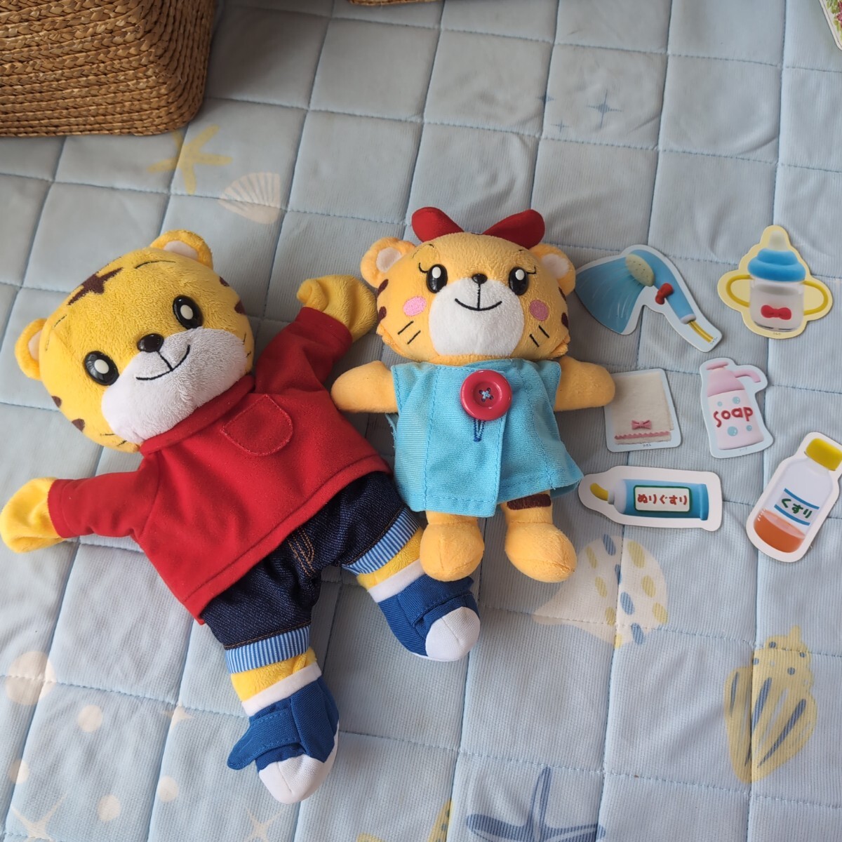 しまじろうのパペット、赤いセーターとデニムパンツ。はなちゃんのぬいぐるみで服は着せ替え練習ができます。はなちゃんお世話カードもついています