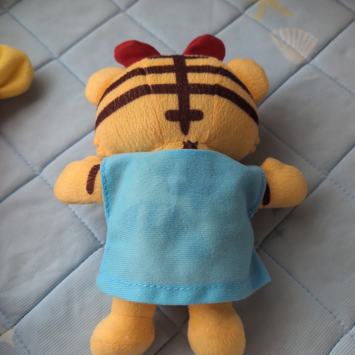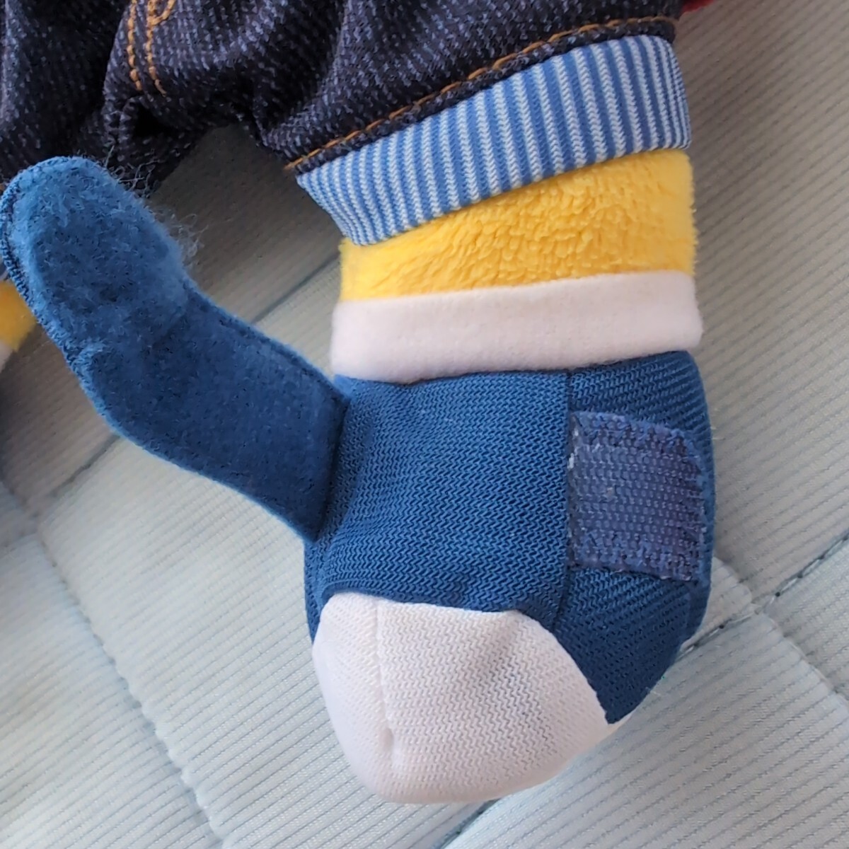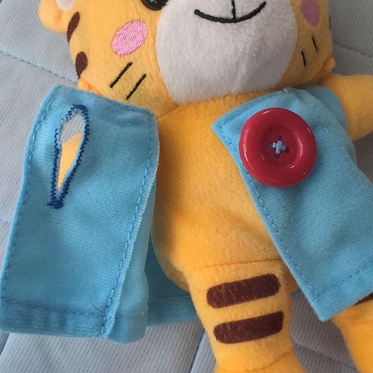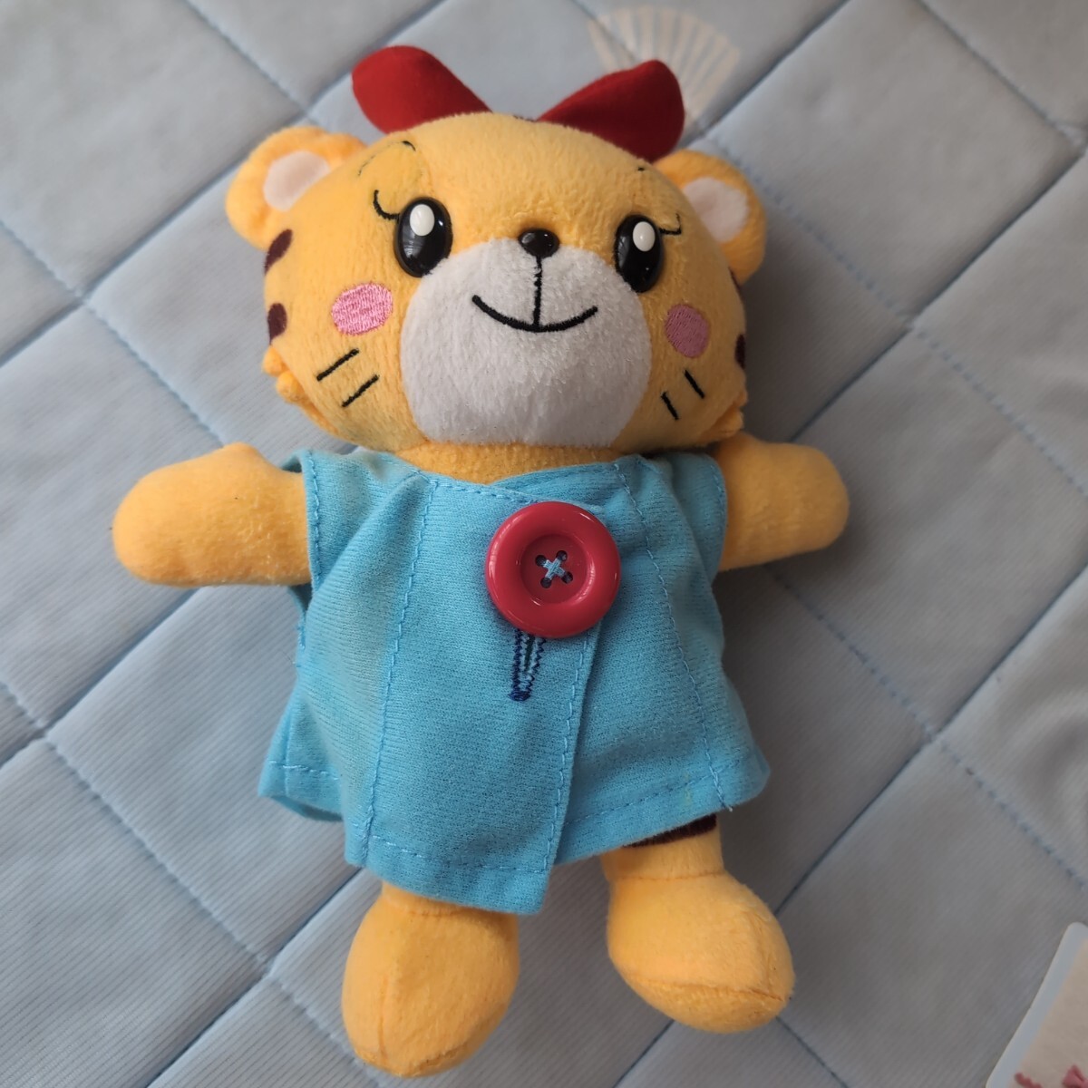 しまじろうのパペット、赤いセーターとデニムパンツ。はなちゃんのぬいぐるみで服は着せ替え練習ができます。はなちゃんお世話カードもついています