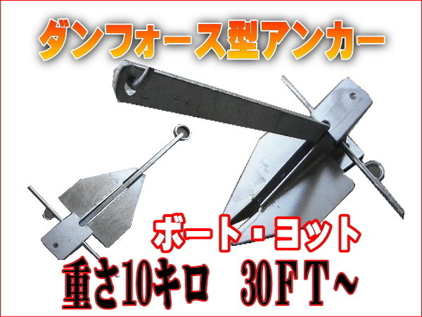 ダンフォース型アンカー10キロ! 数あるオークションの中からご覧頂き有り難う御座います。 ~30フィート用のアンカーです。 プレジャーボートでは定番のアンカーです。重量別では一番アンカーリング効果が 得られます。砂地や砂利地などに刺さるようにホールド致します。 万が一岩場などに根掛かりしても、反対側の穴に回収用ロープを繋いで逆から 引けばほとんどの場合回収できます。使用時はロープ2本掛けをお勧めいたします。 マリン用品セール中! 定価9768円(税込)~プライスダウン! 亜鉛メッキ仕上げ・重さ10キロ アンカーロープ角度を30~40°にするとホールド性が上ります。 その他各種アンカー出品中です!こちらをクリック!!