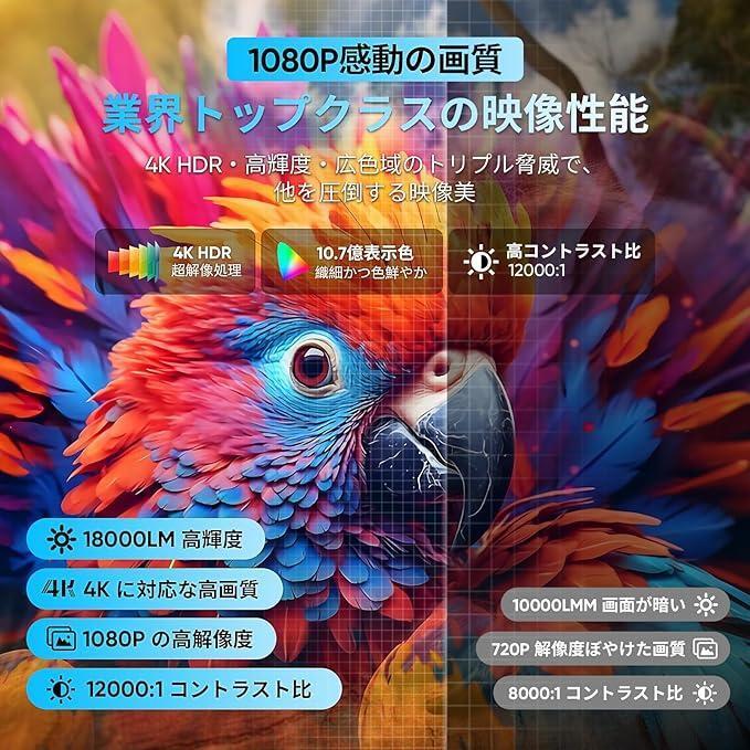 18000ルーメンという高輝度で、昼間でもくっきり鮮明!12000:1の驚異的コントラストが作り出すのは、もう「映像」じゃない…「現実そのもの」の衝撃!「髪の毛一本一本、肌の質感、背景の微細な模様まで…」まるで画面から飛び出してきそうな超精細表現! 特に大画面で視聴すると、その臨場感は圧倒的で、まるで目の前に情景が広がっているかのような没入感が得られます。専用のスクリーンがなくても自宅の壁に投影するだけで、きれいな映像を楽しめます。また、拡散反射の原理でテレビの直射光より小型プロジェクターの拡散光源がもっと柔らかくて、視覚的に楽しみながら目をしっかり守ることができます。