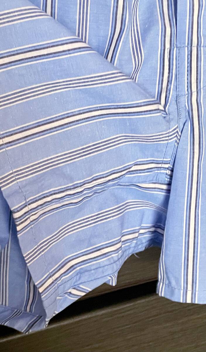 素材は綿100%のさわやかなブルーに白とチャコールのラインがある先染め生地です。